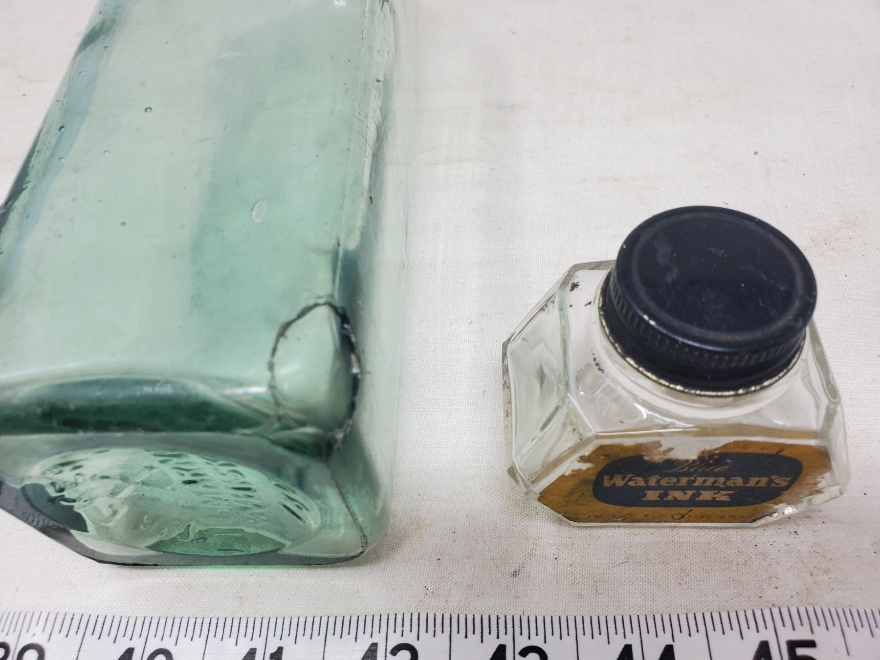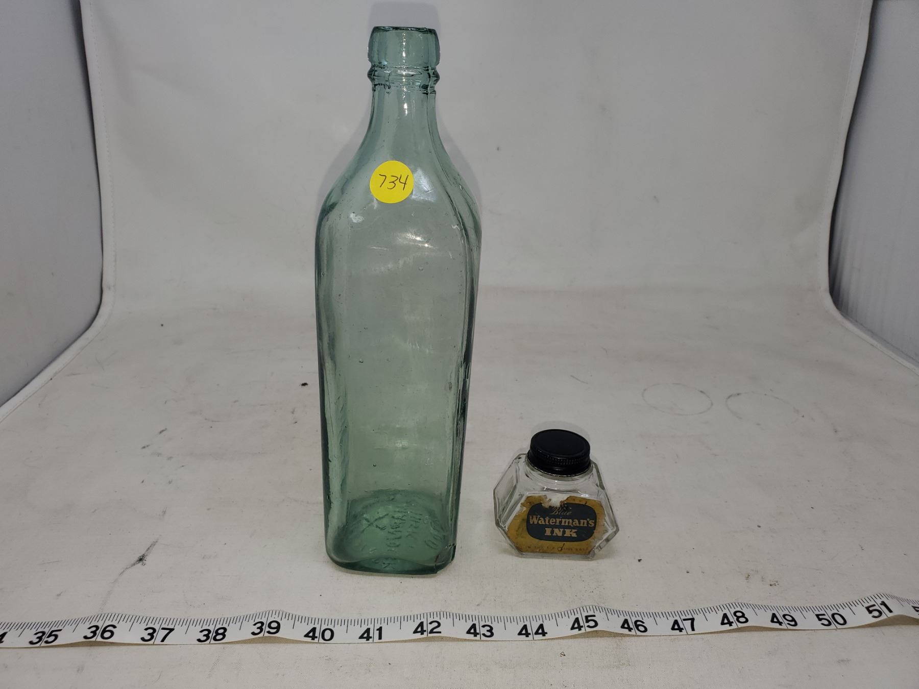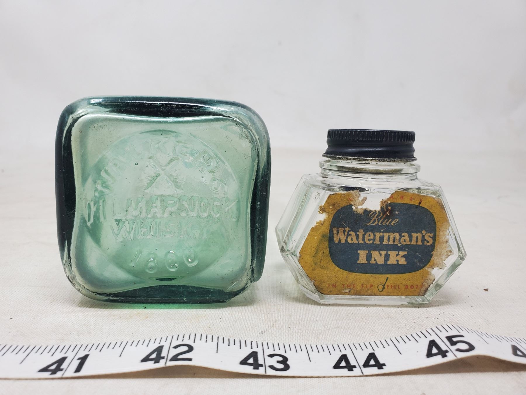 GLASS INK WELL, KILMARNOCK WHISKEY BOTTLE