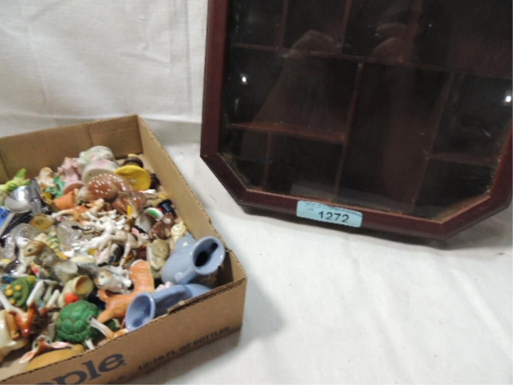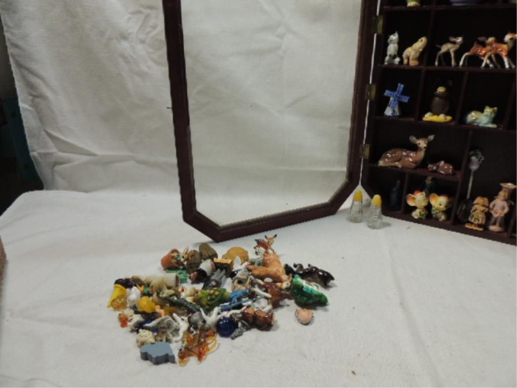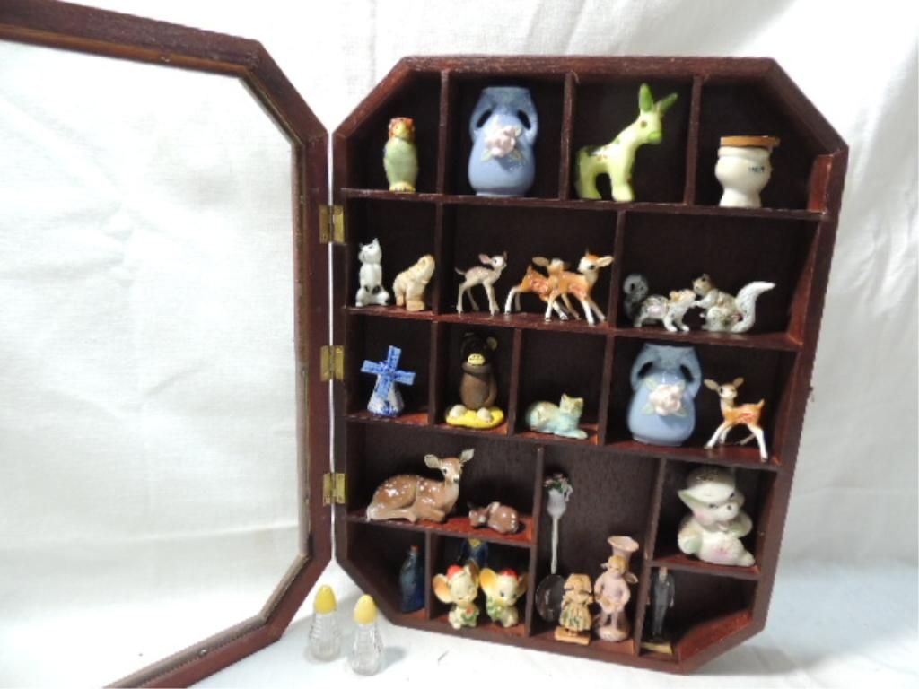 CURIO CASE WITH OVER 3 DOZEN ASSORTED GLASS PIECES. SEE PICTURES FOR MORE DETAILS.