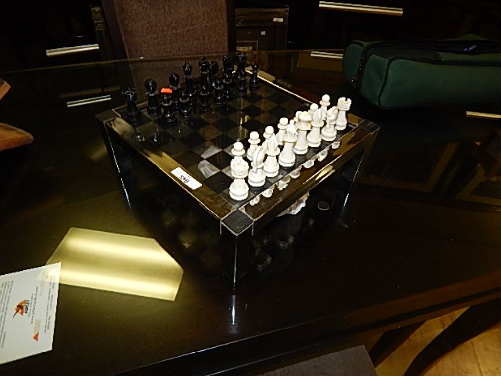 GLASS & METAL CHESS BOARD - (MISSING 2 MEN)