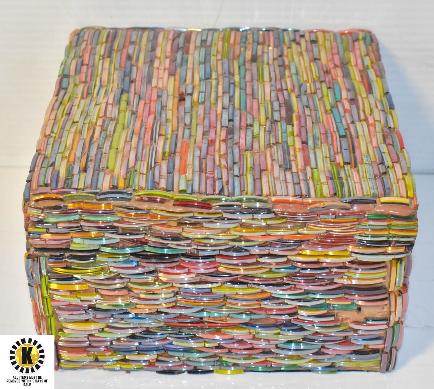 FELT LINED, HEAVY GLASS MOSIAC LIDDED BOX, 7.25 INCHES X 7.25 INCHES X 4.25 INCHES TALL