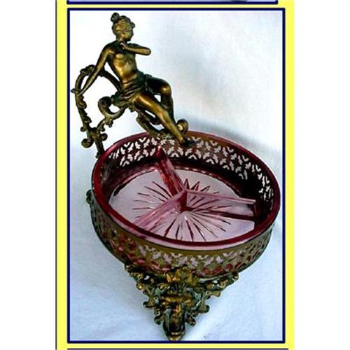 Pink glass divided bowl held in a gilt metal mount with figural mask feet and a nude figure of a woman on the handle.<BR>Measures 8 1/2inches high, 9inches accross at widest point and bowl is 7inches in diameter.<BR>Pink glass is divided into 3 sections and has starburst cut into the underside.<BR>The reticulated openwork gilt metal mount is further decorated by fine etching. <BR>Stands on 3 figural mask heads - each with open mouth and scrolling foliage. Extremely fine detail to faces. The Rococco handle, also in the form of scrolling foliage and vines supports a gilded nude figure of a woman, her hair swept up above her head, one hand outstretched as though to balance herself. <BR>There are a few negligible fleabites on the rim of the glass, but otherwise, condition is good.