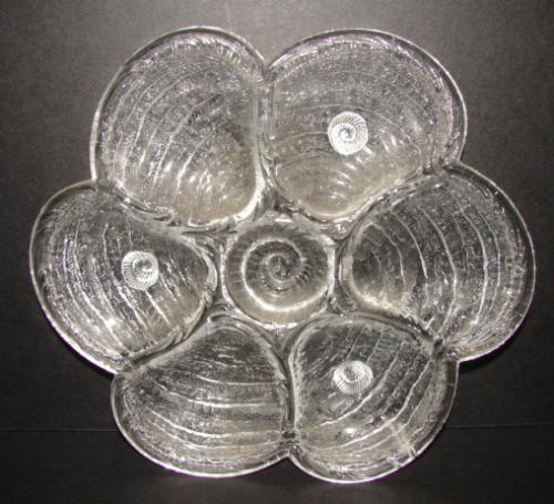GLASS OYSTER PLATE. Relief shell decorated. 8.75” Dia.
