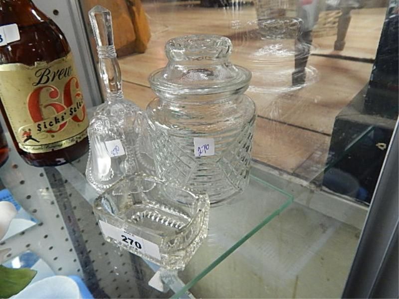 GLASS PIN BOX, GLASS BELL & GLASS JAR WITH LID