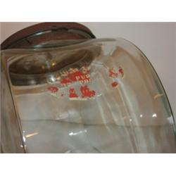 GLASS STORE CANDY JAR. Marked on bottom with H and anchor. Illegible partial label on back. Lid shows signs of rusting. 9.75" H