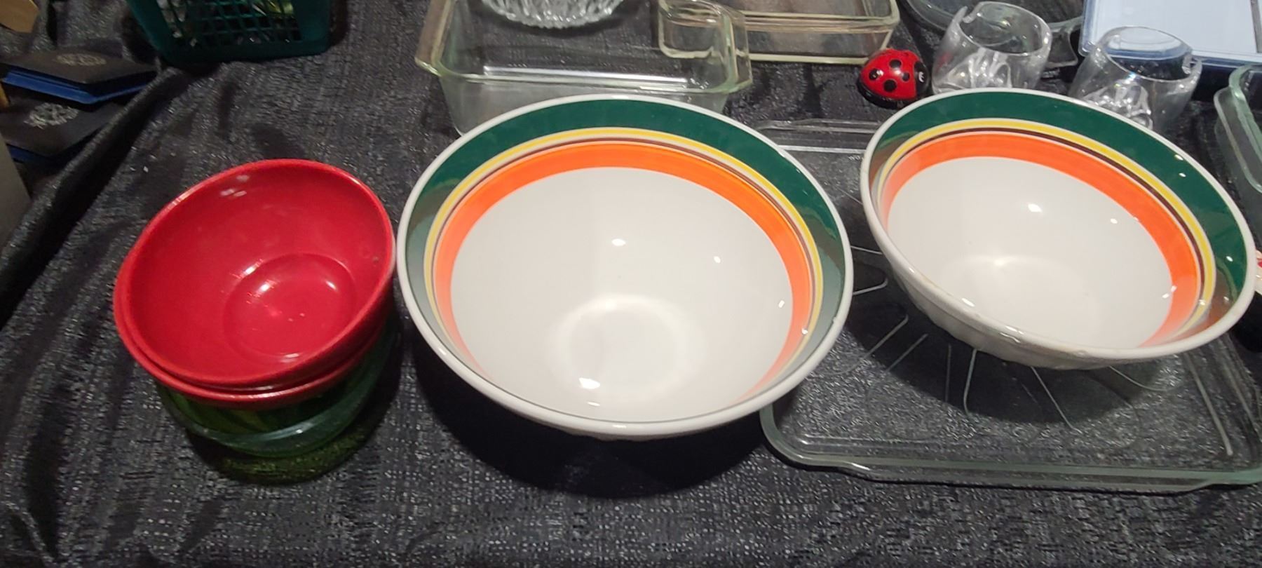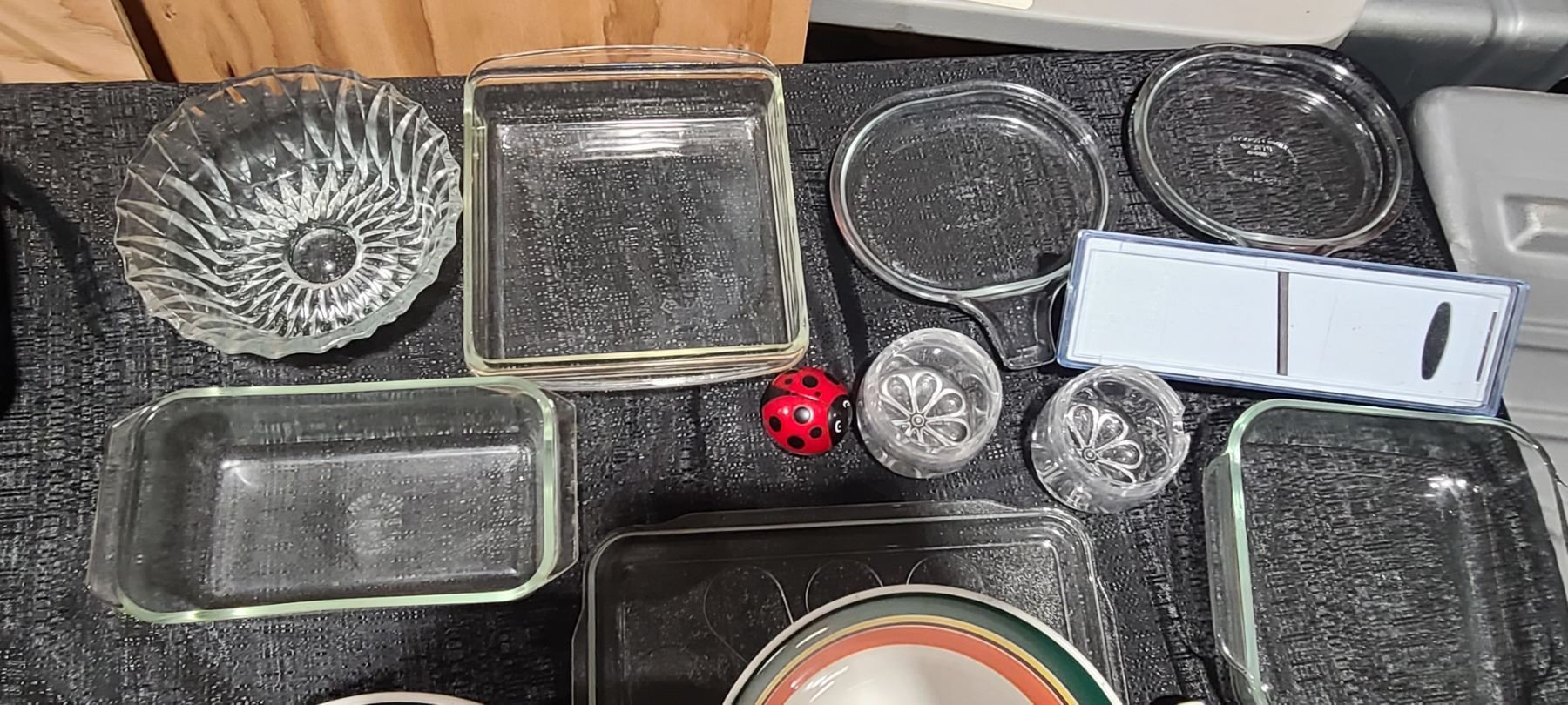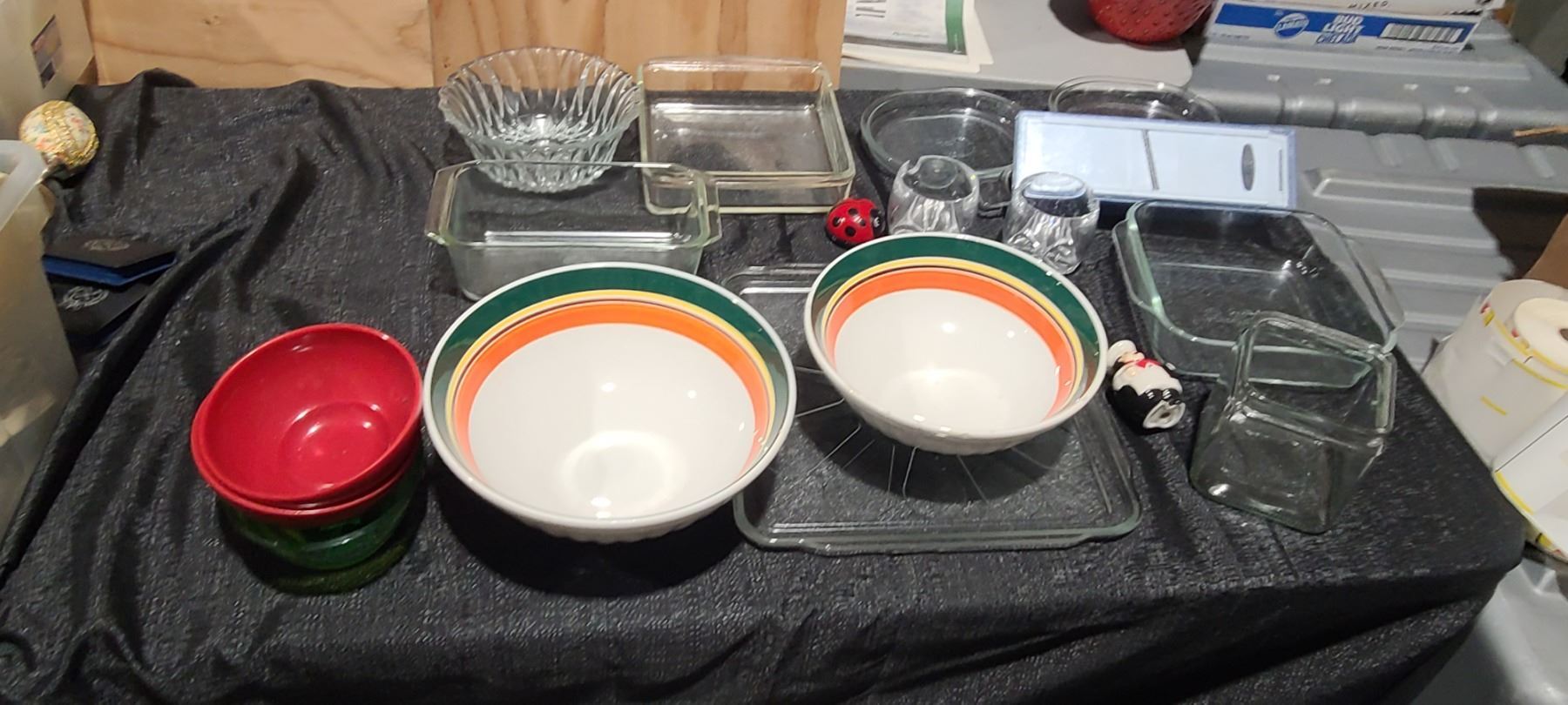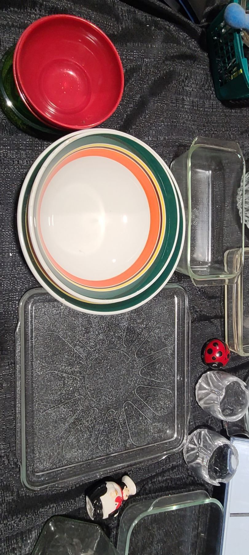 GLASSWARE, PYREX, BOWLS, S& P SHAKERS VEGETABLE SLICER, LADY BUG TIMER, AND OTHER MISC. PLEASE SEE PHOTOS.