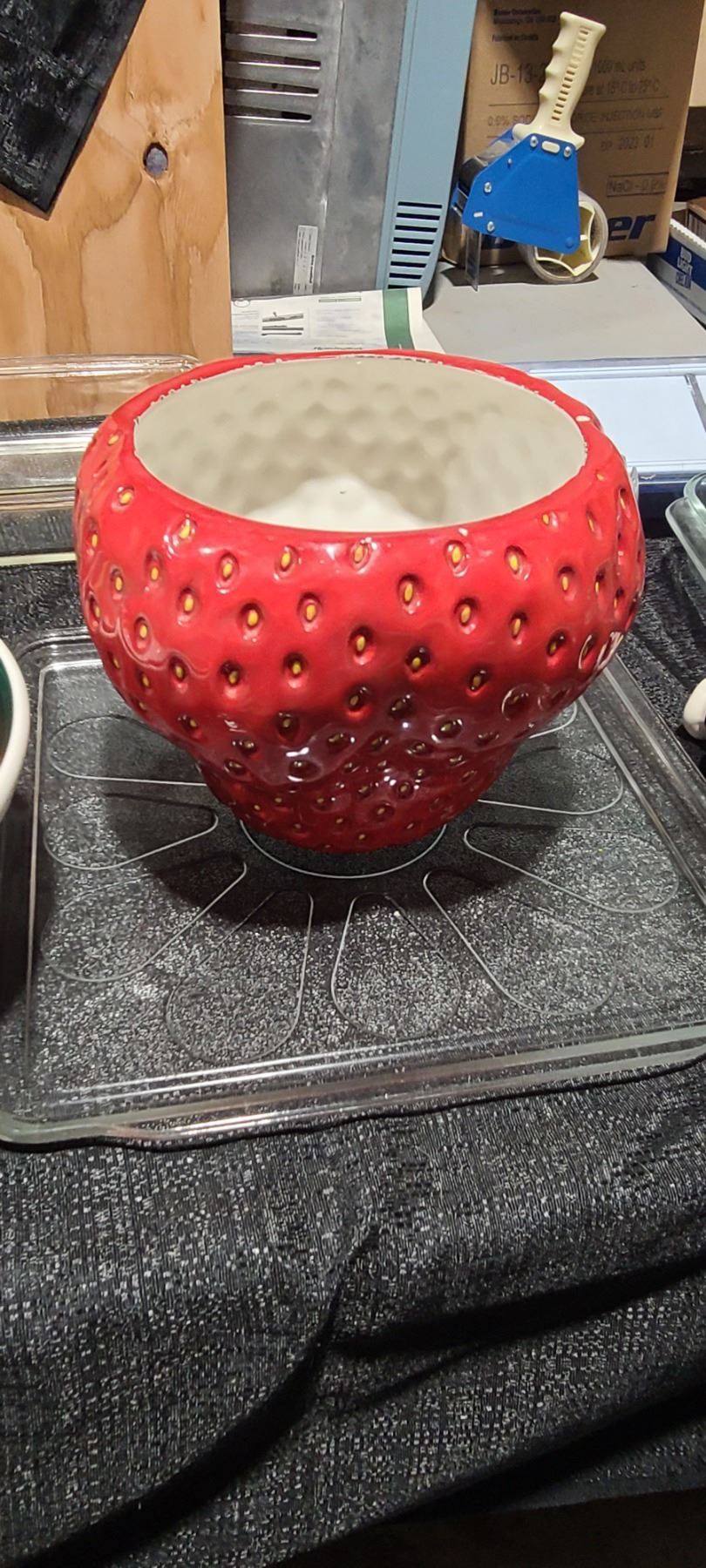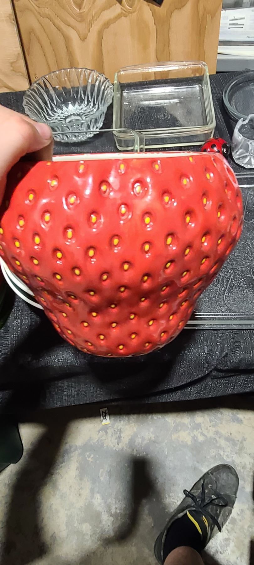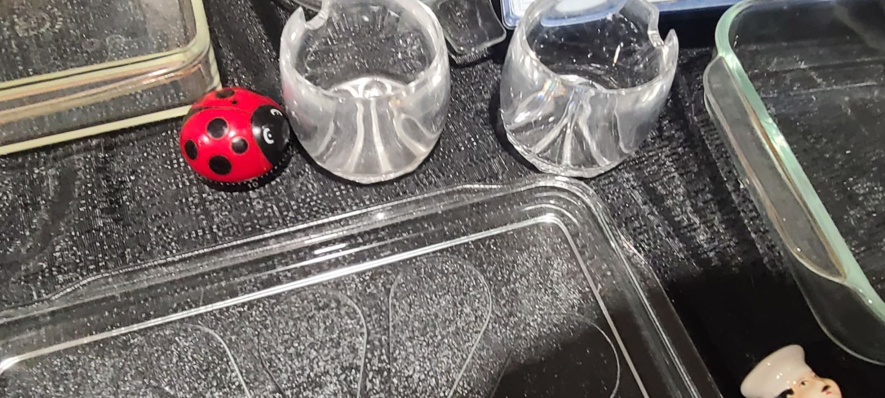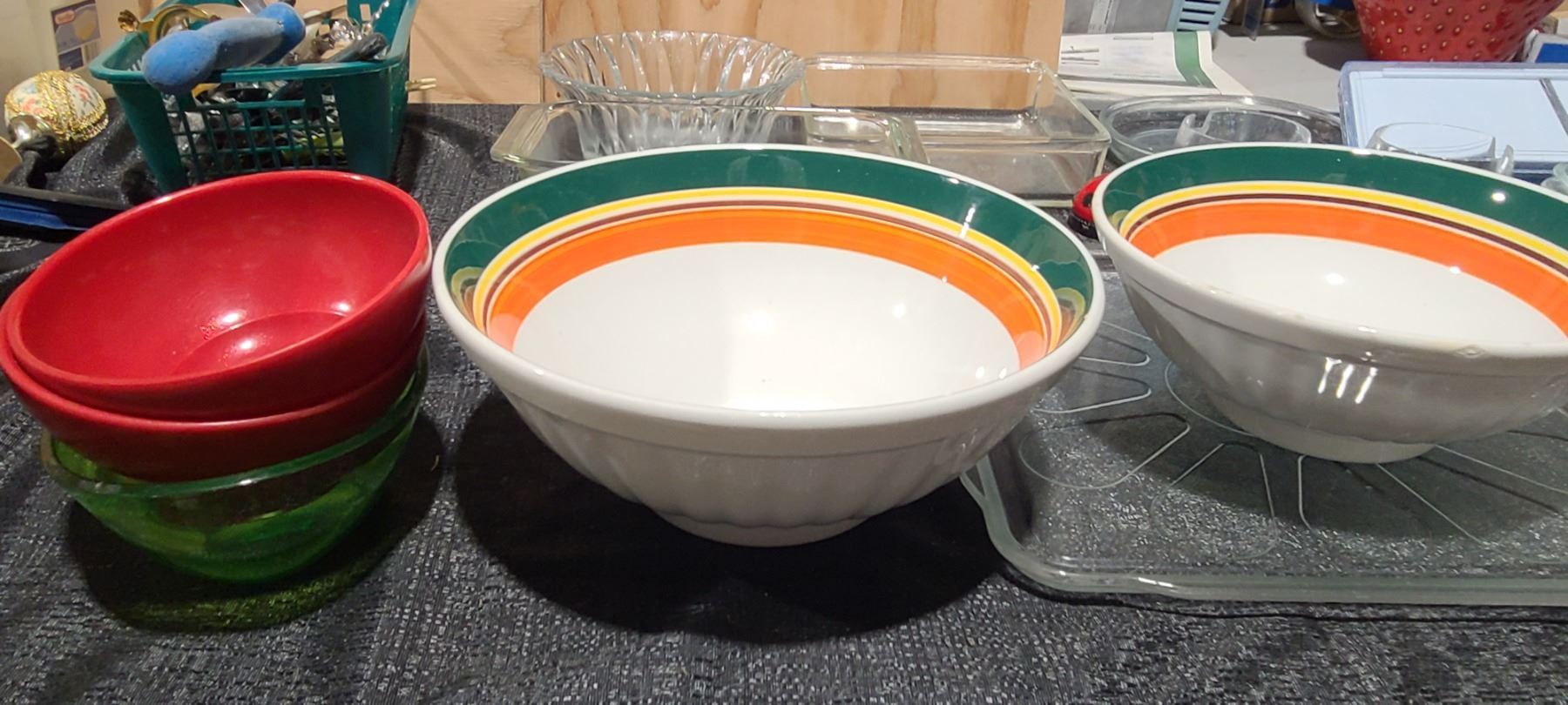 GLASSWARE, PYREX, BOWLS, S& P SHAKERS VEGETABLE SLICER, LADY BUG TIMER, AND OTHER MISC. PLEASE SEE PHOTOS.