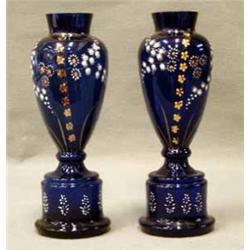 1 PAR VASER, RUND FOT, UTSVÄNGT LIV, HANDMÅLAD DEKOR AV LILJEKONVALJ PÅ BLÅTT GLAS, 1800-TAL, H26