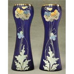 1 PAR VASER, FLUSSGLAS, RUNDA MED INSVÄNGDA MIDJOR, MÅLAD DEKOR AV JUGENDBLOMMOR, C. 1900, H36 (EN MED SMÄRRE MYNNINGSNAGG)