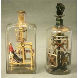 2 FLASKOR, EN REKTANGULÄR, EN RUND, INNESLUTEN VÄVSTOL MED DOCKFIGUR, 1 MED SPINNREDSKAP, 1800-TAL, H20 (2)