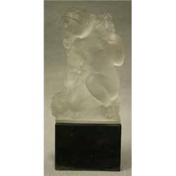 SKULPTUR, FROSTAT GLAS, NAKEN KVINNA SITTANDE PÅ HUK OMGIVEN AV BLOMSTER, SIGN. LALIQUE, PARIS, SVART TRÄSOCKEL, H20