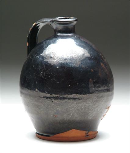 GLAZED MAINE REDWARE JUG. Small size with black glaze. PROVENANCE: From a Gardiner, Maine home. SIZE: 6-3/4in. h. CONDITION: Very good, one small area of glaze loss. 9-25990