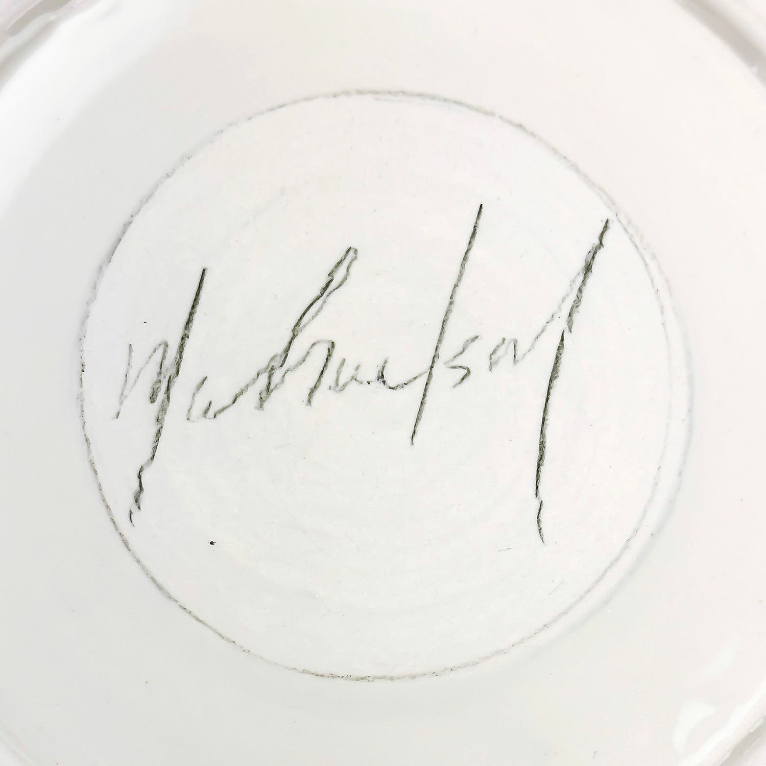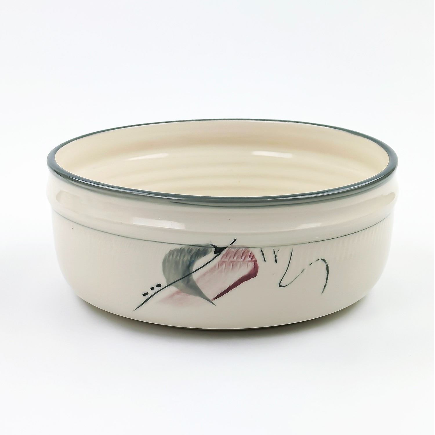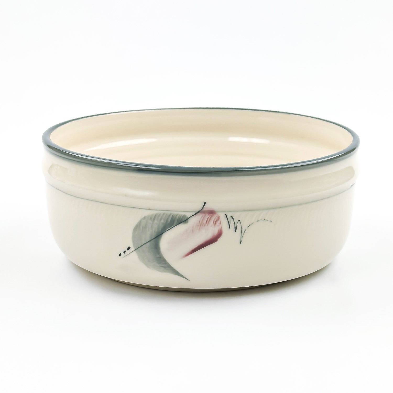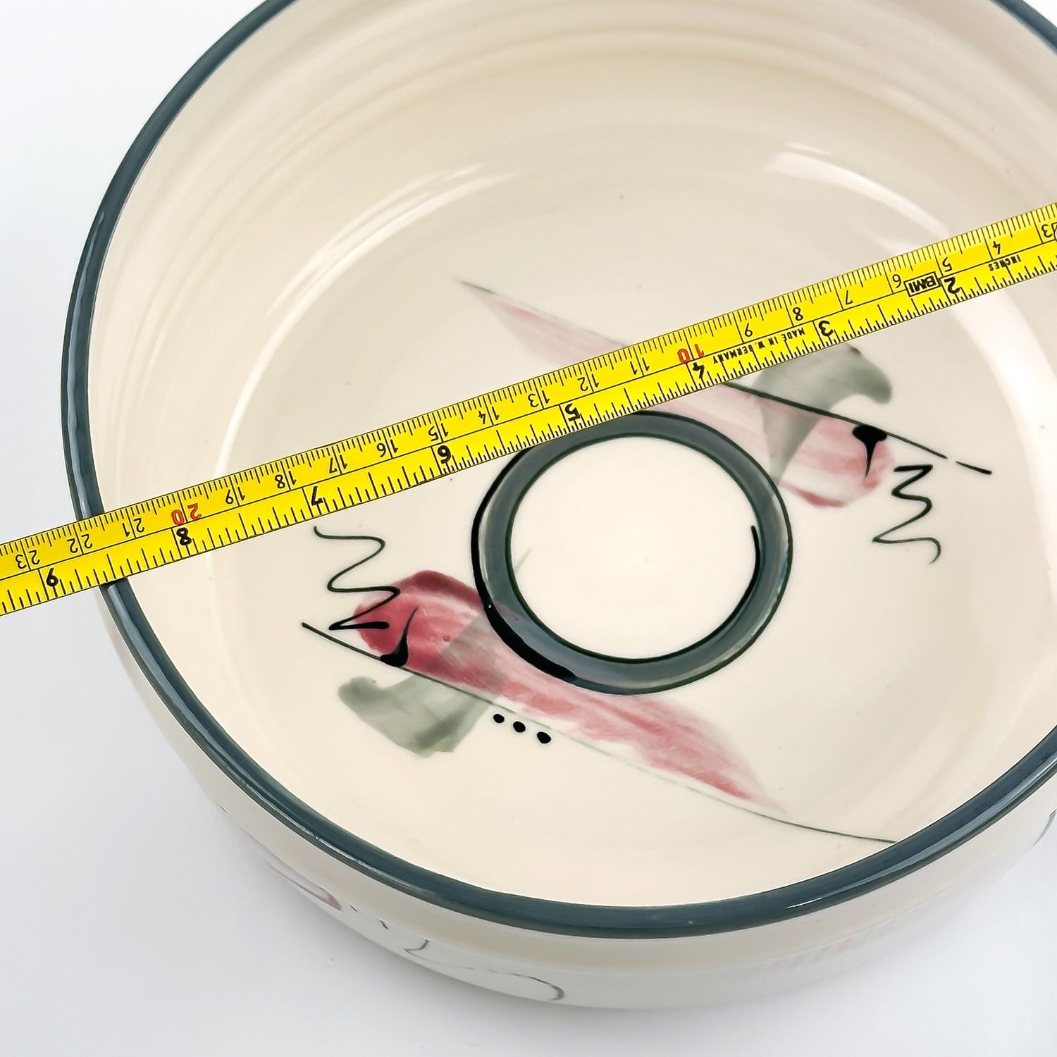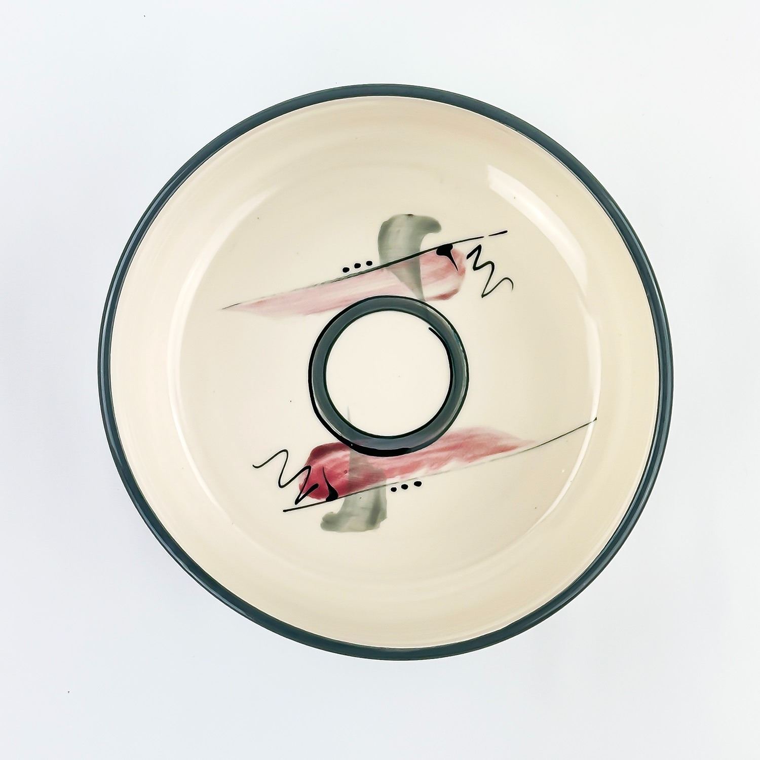 #8053 - GLAZED HAND THROWN ART POTTERY SERVING DISH BOWL - ABSTRACT ART DESIGN IN AND AROUND BOWL. ARTIST SIGNED SIGNATURE ON BOTTOM. MEASURES: 8.75” (22 CM) IN DIAMETER AND SITS 3.5” (9 CM) HIGH.
