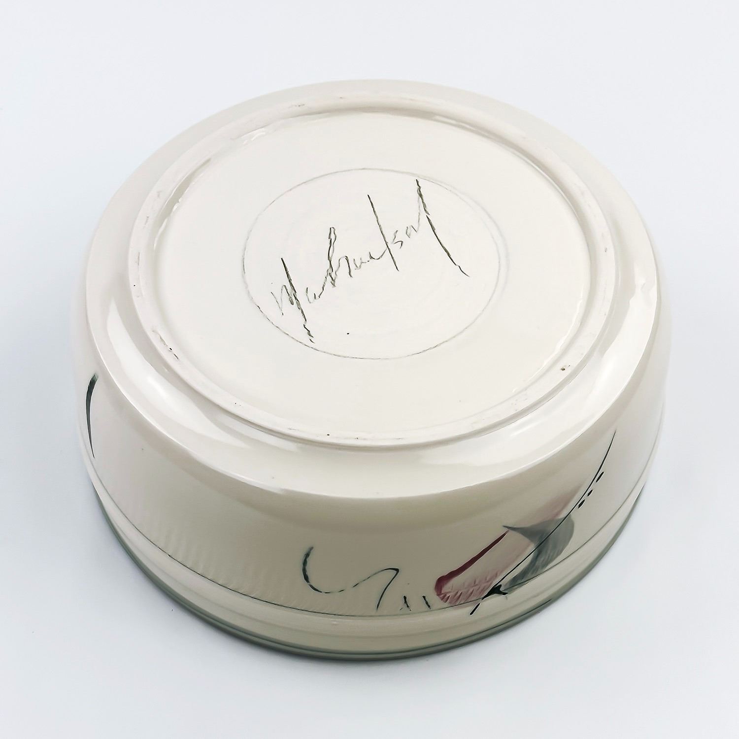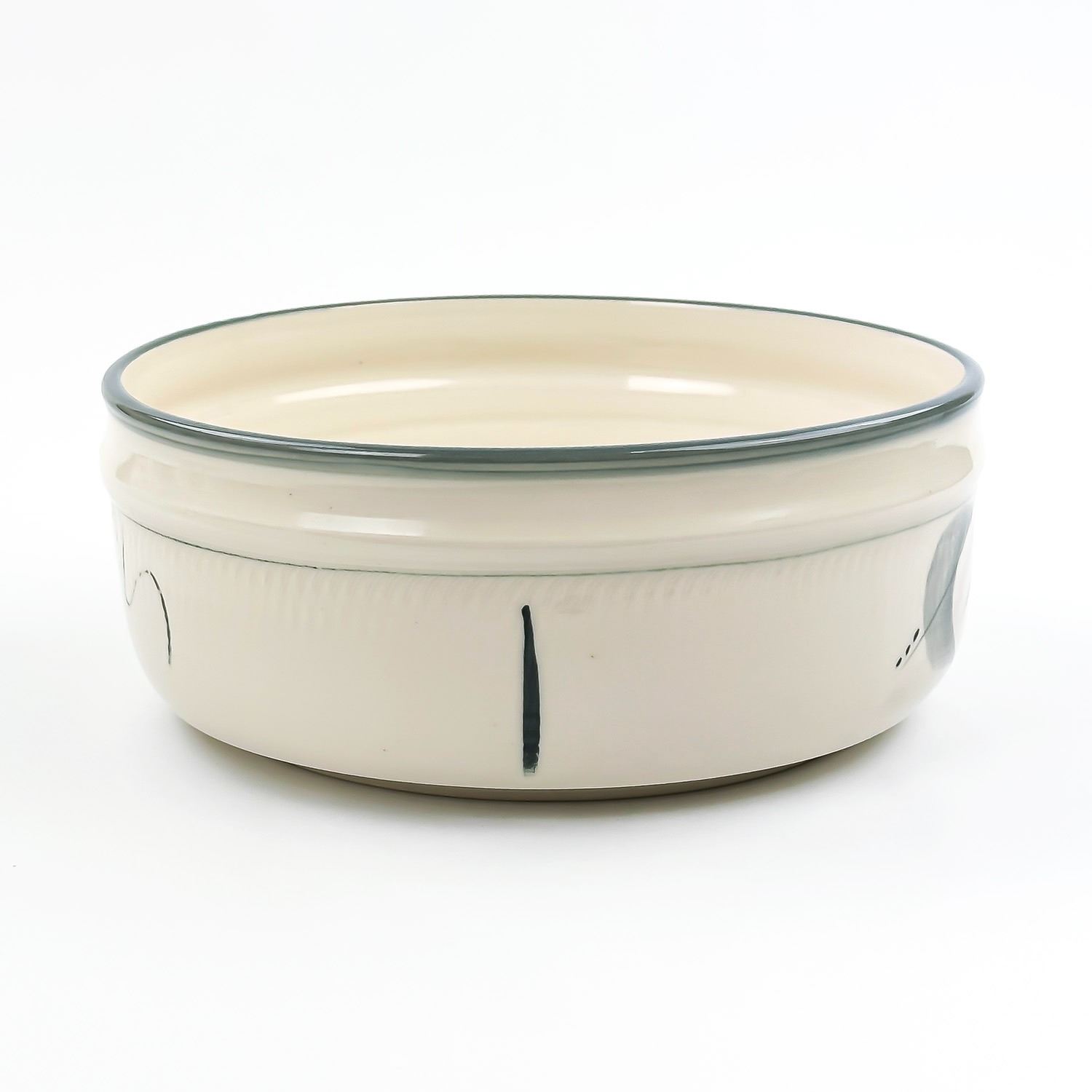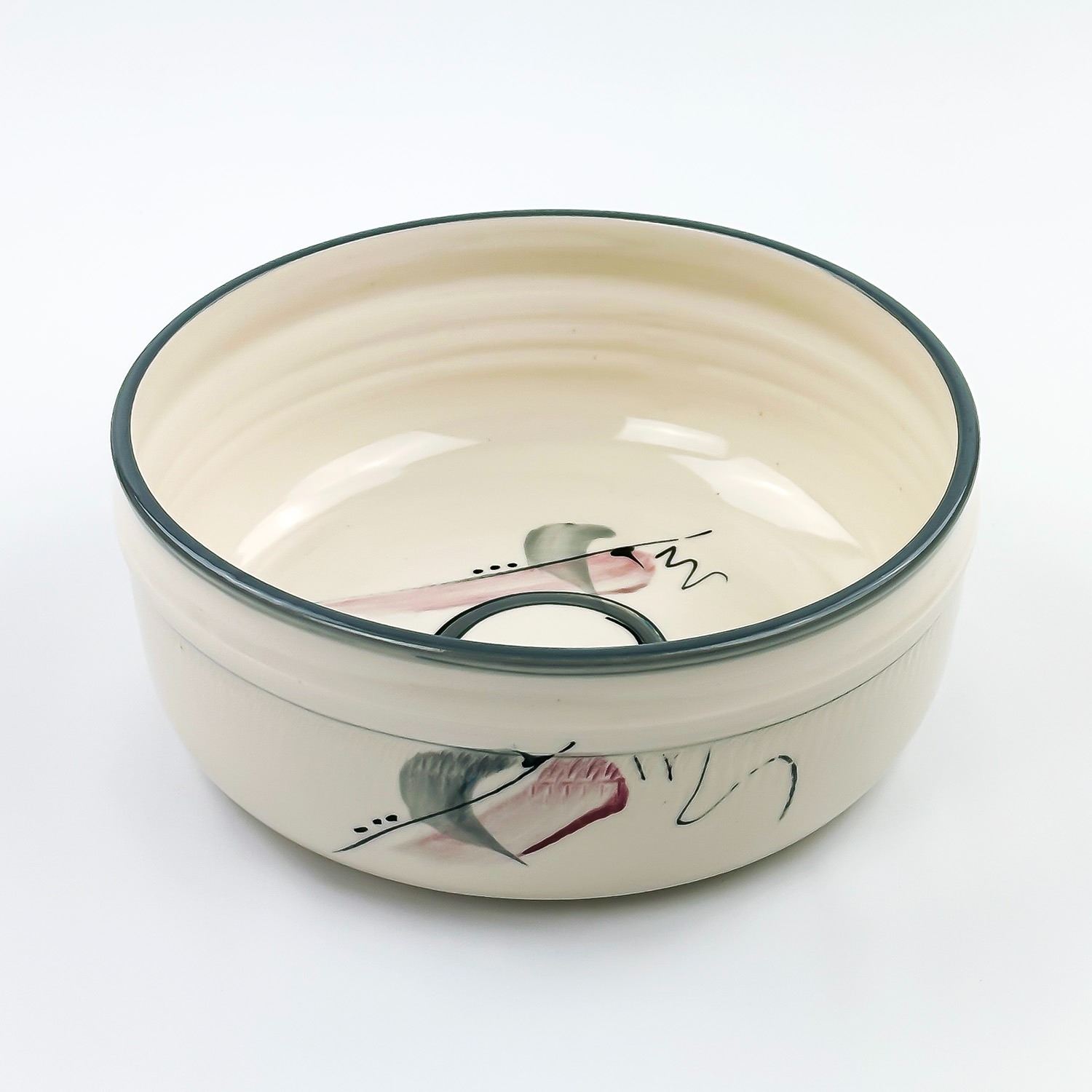 #9096 - GLAZED HAND THROWN ART POTTERY SERVING DISH BOWL - ABSTRACT ART DESIGN IN AND AROUND BOWL. ARTIST SIGNED SIGNATURE ON BOTTOM. MEASURES: 8.75” (22 CM) IN DIAMETER AND SITS 3.5” (9 CM) HIGH.