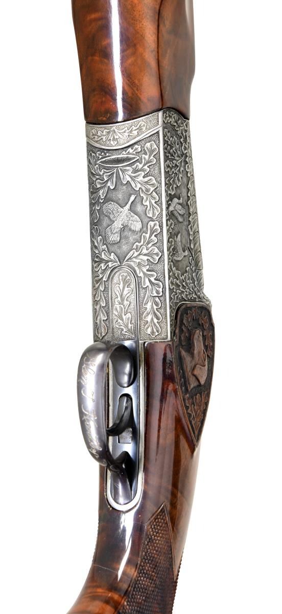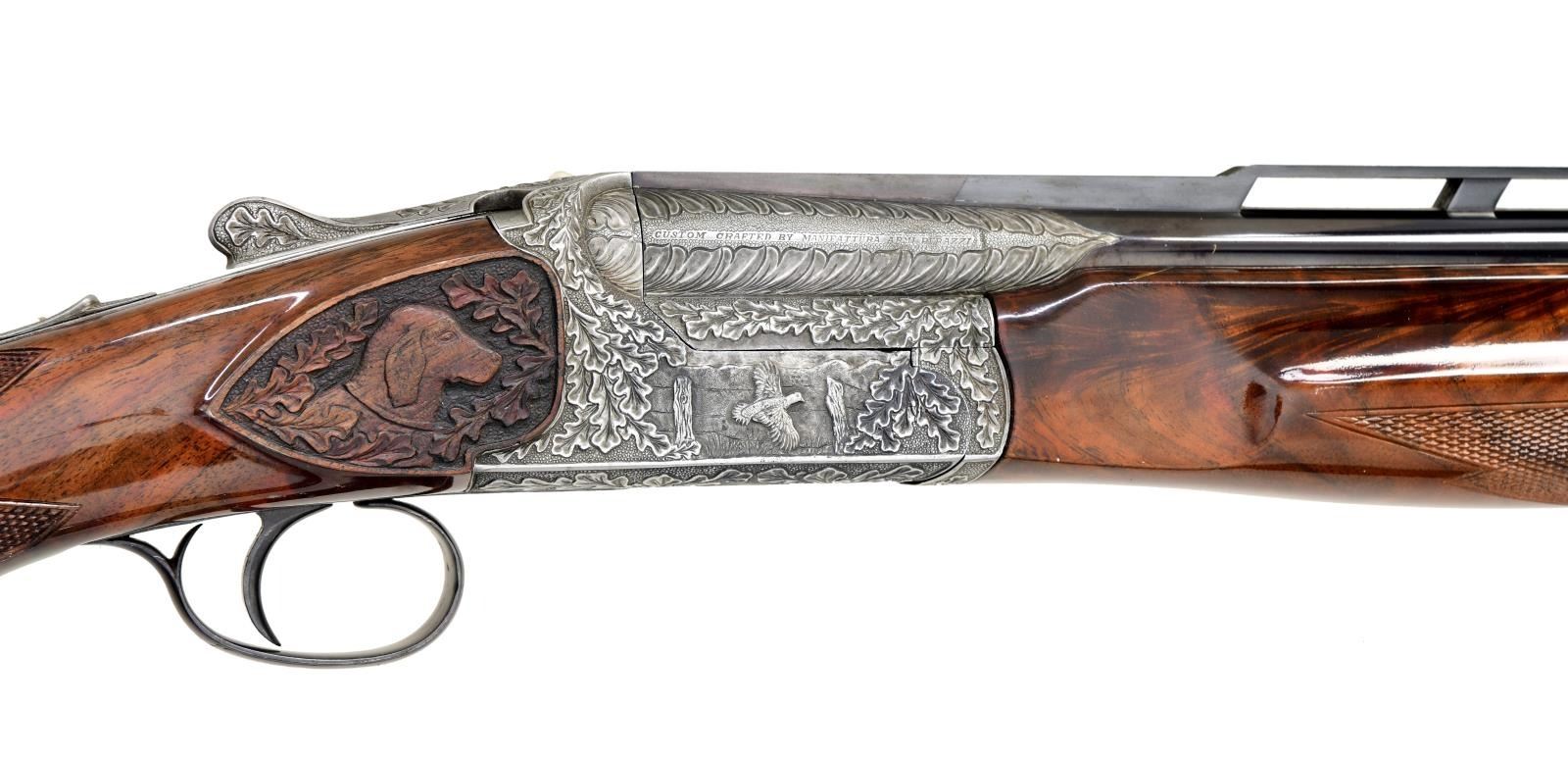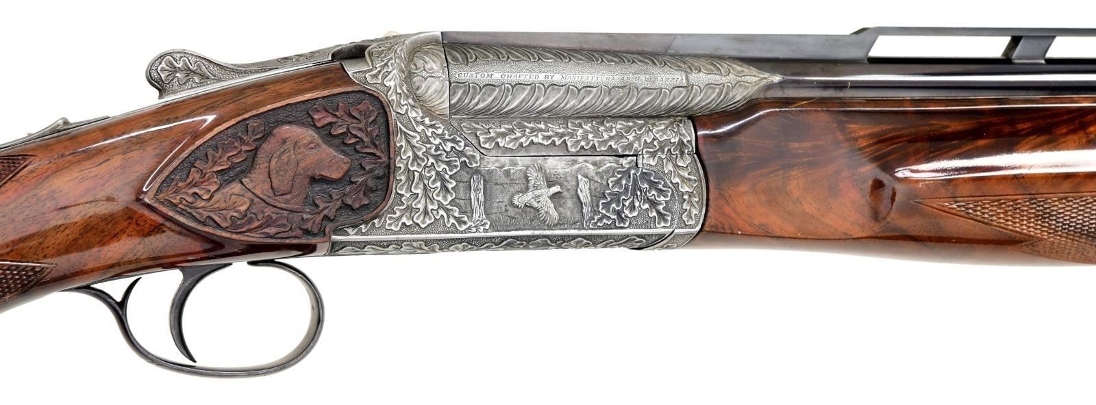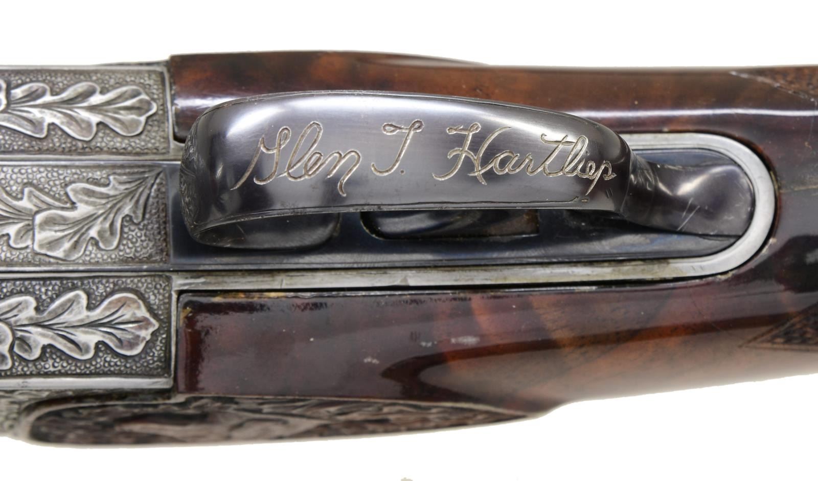 SHOTGUN. Cal. 12 ga. 2 3/4". S# 1282. Bbl. 32" with raised rib and fixed full choke. White target front sight, filler in rear sight hole. Satin gray finished action with full coverage, deep relief oak leaf hand engraving. Right side features a flying partridge. Left side shows two flushing mallards and floorplate features a flying turkey. Top tang is marked "Engr. by G. Hartliep" Trigger guard bow is engraved "Glenn T. Hartliep". Beavertail forearm and Monte Carlo custom stock of fancy claro walnut with gloss finish & hand checkering having a forward sweeping pistol grip. LOP: 14 1/4" over solid black Galazan pad. Drop to Parallel Comb: 1 5/8". DAH: 3". Neutral cast. Weight: 8 lbs. 6.2 oz. Glen Hartliep is the son of the late Master Engraver and former NRA instructor Neil Hartliep. UNATTACHED ACCESSORIES: original stock and forend. CONDITION: fine as upgraded. 97% metal finish. Wood finish shows small scratches and marks. Very good bore. (24-1982/DS). CURIO.$6,500-8,500
