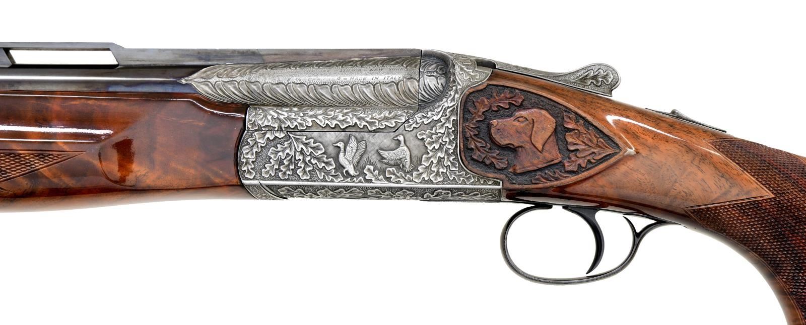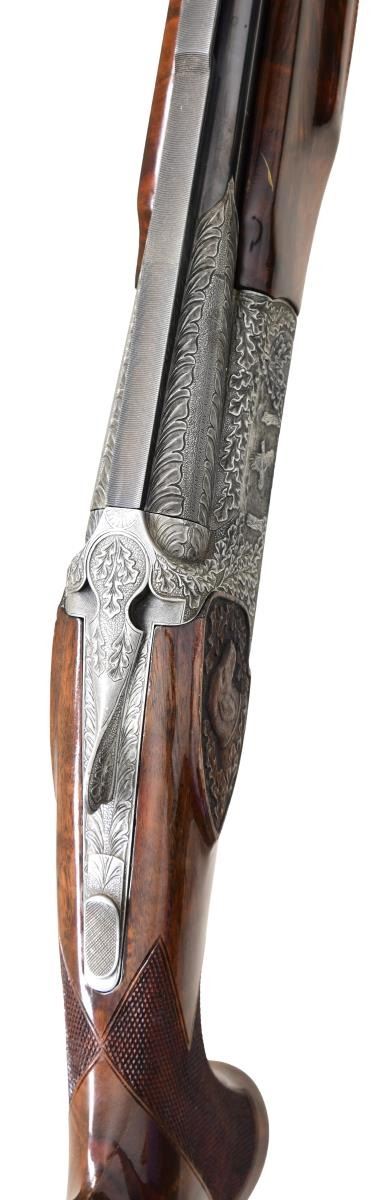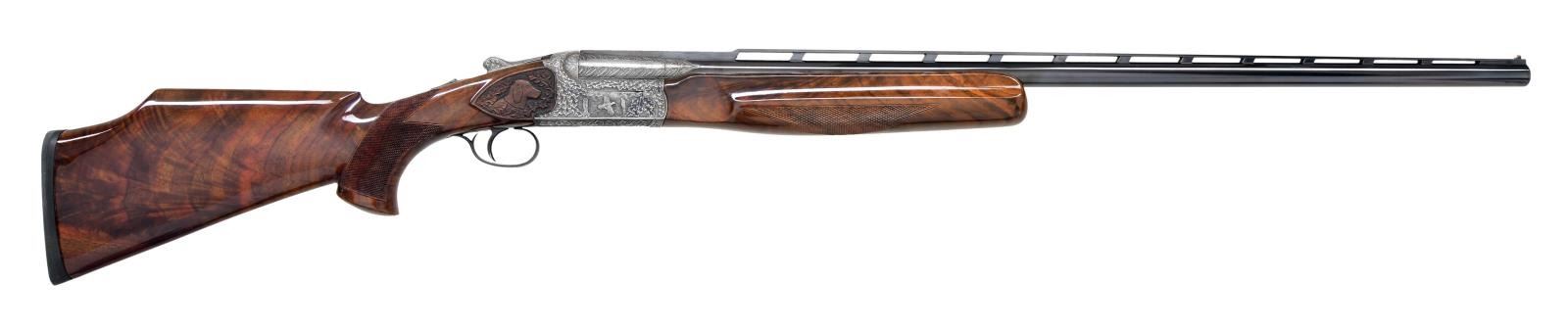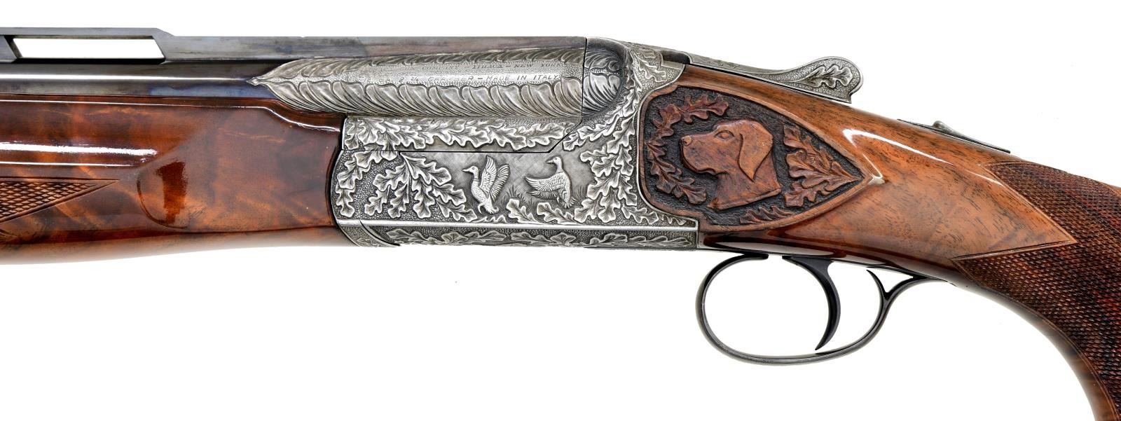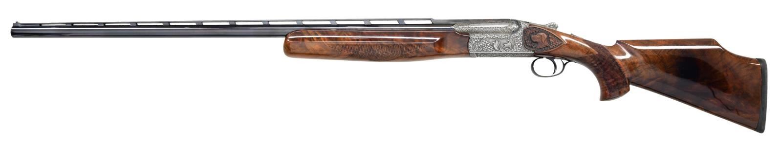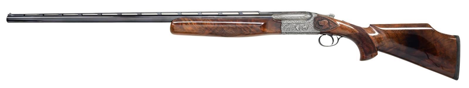 SHOTGUN. Cal. 12 ga. 2 3/4". S# 1282. Bbl. 32" with raised rib and fixed full choke. White target front sight, filler in rear sight hole. Satin gray finished action with full coverage, deep relief oak leaf hand engraving. Right side features a flying partridge. Left side shows two flushing mallards and floorplate features a flying turkey. Top tang is marked "Engr. by G. Hartliep" Trigger guard bow is engraved "Glenn T. Hartliep". Beavertail forearm and Monte Carlo custom stock of fancy claro walnut with gloss finish & hand checkering having a forward sweeping pistol grip. LOP: 14 1/4" over solid black Galazan pad. Drop to Parallel Comb: 1 5/8". DAH: 3". Neutral cast. Weight: 8 lbs. 6.2 oz. Glen Hartliep is the son of the late Master Engraver and former NRA instructor Neil Hartliep. UNATTACHED ACCESSORIES: original stock and forend. CONDITION: fine as upgraded. 97% metal finish. Wood finish shows small scratches and marks. Very good bore. (24-1982/DS). CURIO.$6,500-8,500