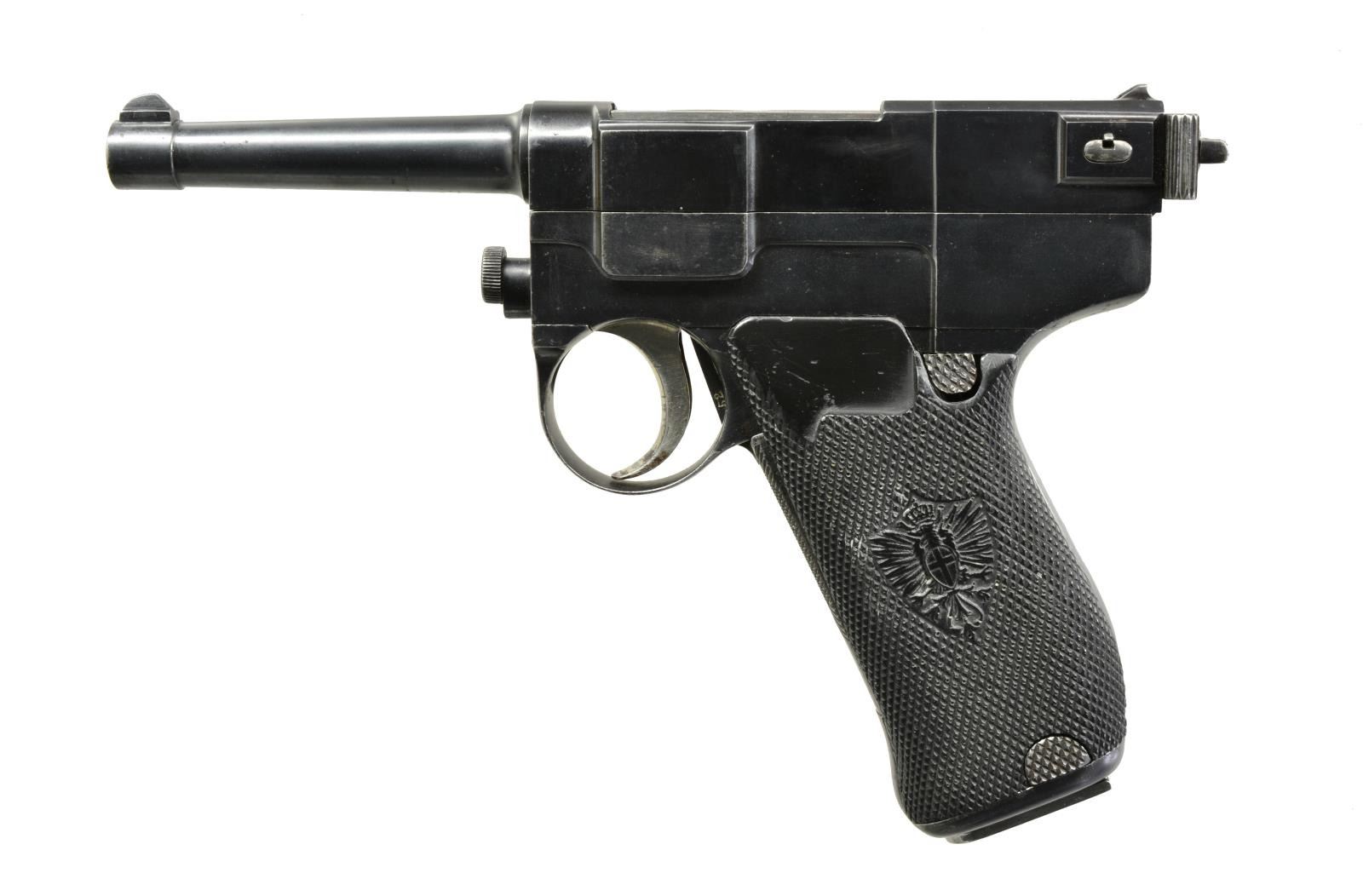 Cal. 9mm Glisenti. S# 352I. Bbl. 3 3/4". Approx. 100,000 mfg. 1900-1915 & used by Italian military during WWI & WWII. Matching numbers on mag. latch, bolt, receiver & safety bar. Checkered grip safety on front strap. Checkered hard rubber grips secured w/out screws having mag. latch at bottom rear of left. “I” is suffix on frame, prefix on receiver & bolt. Glisenti caliber dimensionally identical to 9mm Luger, but of considerably less power; 9mm Luger should under no circumstance be fired in this pistol. Backstrap machined at base to incorporate lanyard loop. MAGS: 1 plated 7 rd. w/ latch notch about midway of left rear having stepped spine. CONDITION: good overall appearance w/ scattered peppery oxidation throughout. Good bore w/ distinct rifling & even light pitting throughout. Replacement right grip by Triple K missing retaining latch at top. Left grip w/ minor marks. (20-1472/NW). CURIO. $700-1,000.