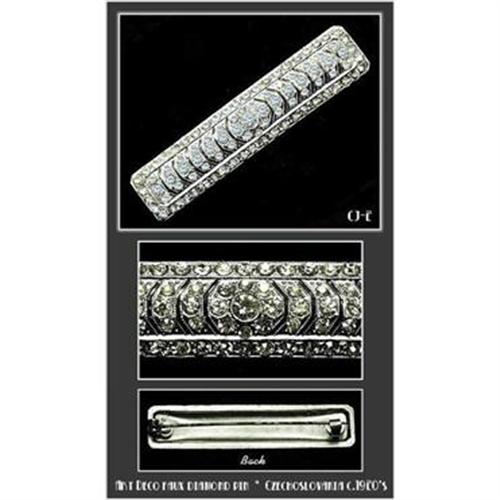 Dazzling 1930's vintage Art Deco pin, set with rhinestones in silvertone base metal, decorated with hand enameling between the stones.. If you can't afford it's vintage $4000 counterpart in platinum with diamonds, here you have a "dead ringer", which you can have at the fraction cost. Excellent unused condition, no stones are missing. It is extremely difficult to capture the beauty, which eye so easily perceives, picture just doesn't do the justice to this exquisite piece. Dimension : 2-3/8" wide. Please note that for Ebay Live Auctions only bids at or over $50.00 will be successful and meet our reserve.
