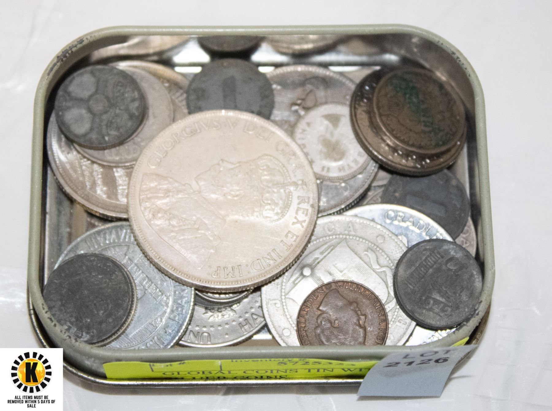 GLOBAL COINS TIN WITH SOME SILVER COINS