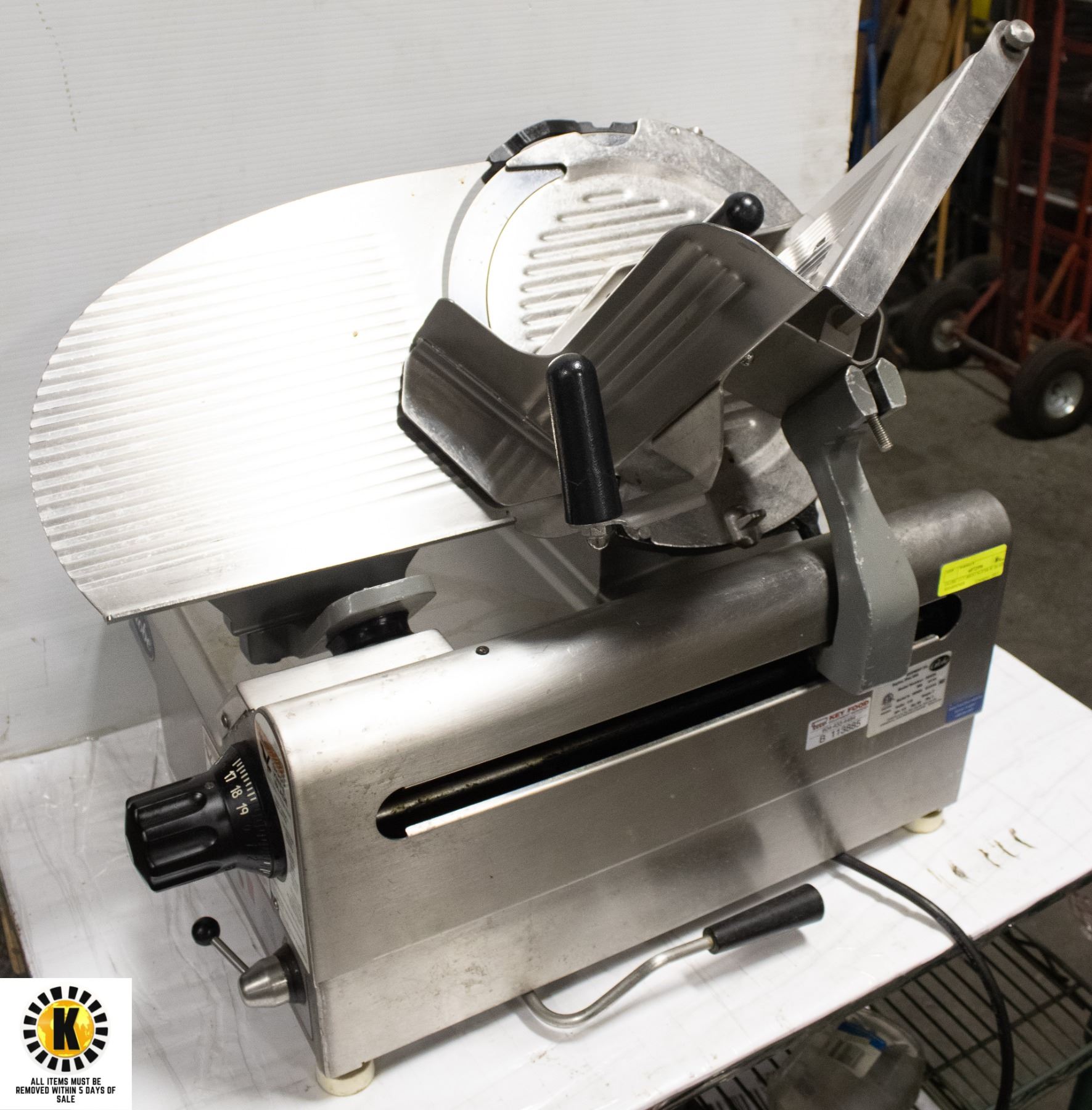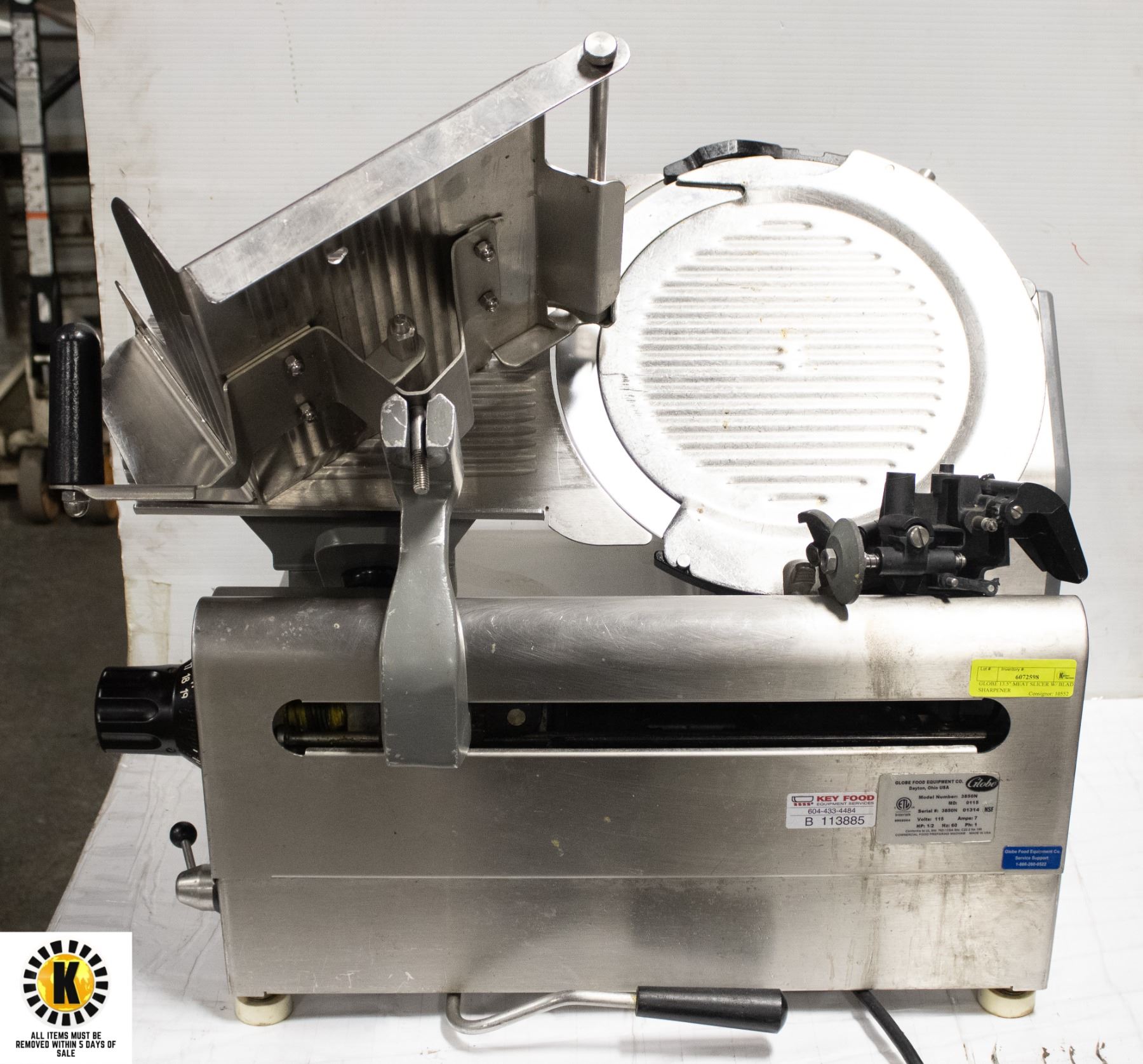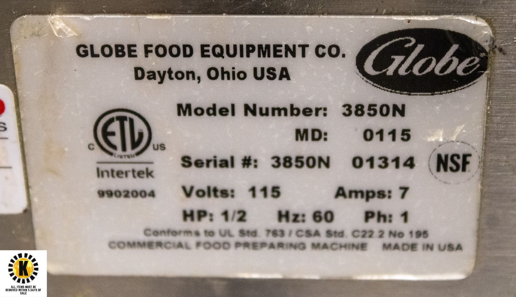 MODEL # 3850N, 115 VOLTS, 7 AMPS, 1/2 HORSE POWER, 60 HZ, PHASE 1, APPROX 22" X 15" X 21" * MISSING PUSHER SCREW * ** BLADE SHARPENER IS BROKEN IN MULTIPLE SPOTS ONE SHARPENING STONE IS MISSING HALF OF THE STONE **