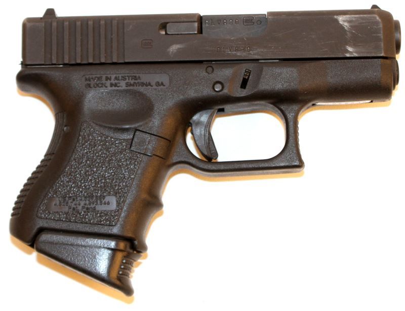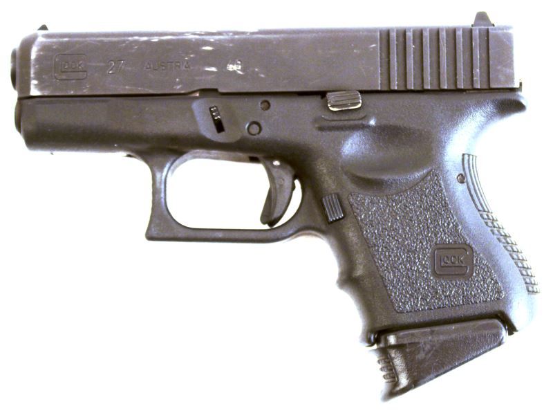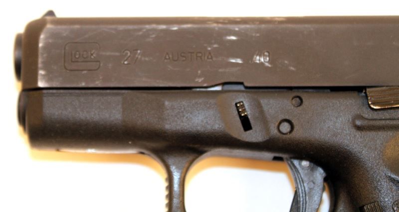 Glock 27 transitional generation (Generation 2.5) between second and third generation designs, showing un-checkered finger grooves, and no accessory rail. Bore is bright and clean, finish is about 90%, showing holster wear to slide towards muzzle. Frame/grips in very good condition. Overall very good condition. Also included is a Safariland belt holster, and Fobus leg holster. Caliber: .40 S&W Serial #: CLV830