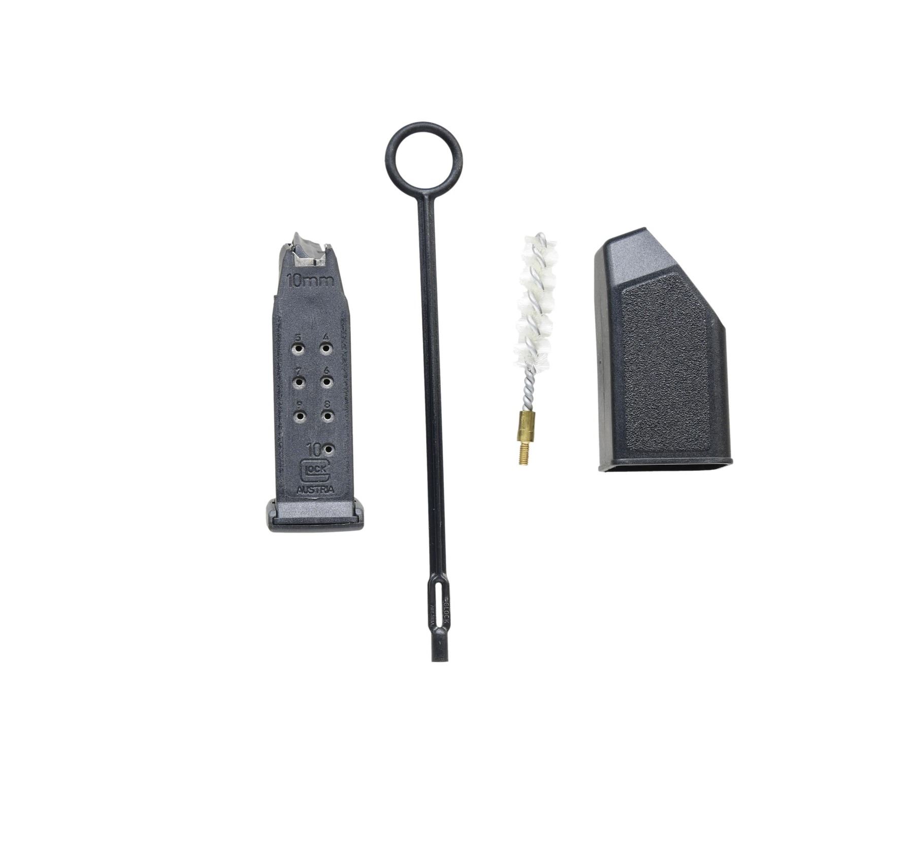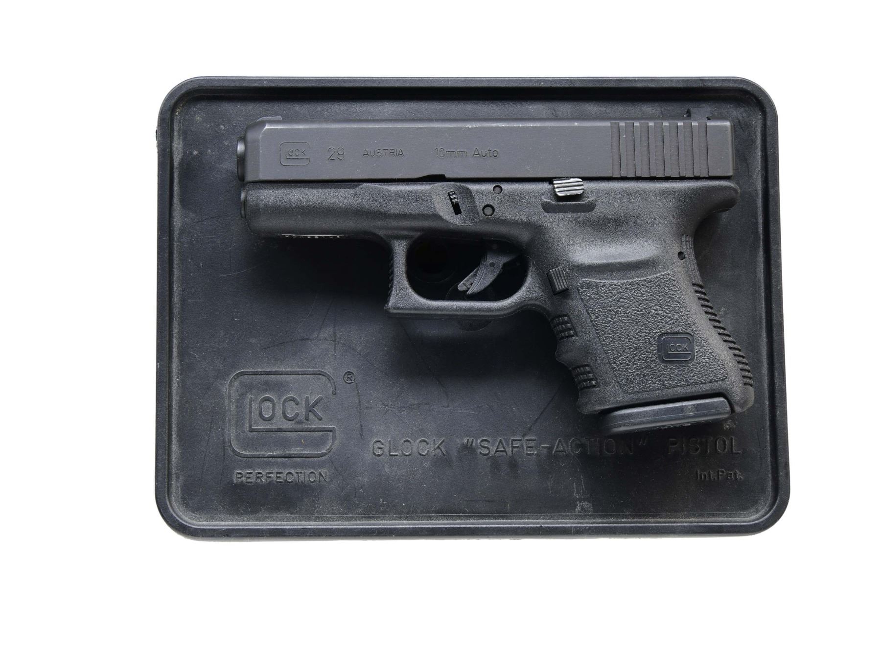 Cal. 10mm. S# CDK921US. Bbl. 3.78" with Trijicon 3-dot sights. The Glock 29 is a semi-auto pistol with a polymer frame and matte black finish. The frame has an integrated slide release and magazine release on the left side. MAGS: two 10 rds. UNATTACHED ACCESSORIES: factory box, speed loader, cleaning rod, and brush. CONDITION: overall near excellent, with approx. 95% of the original finish remaining on the slide and frame. Bore is bright with strong rifling. PROVENANCE: from the lifelong collection of Terrence McCarty. (24-194/MD). MODERN. $300-$400.