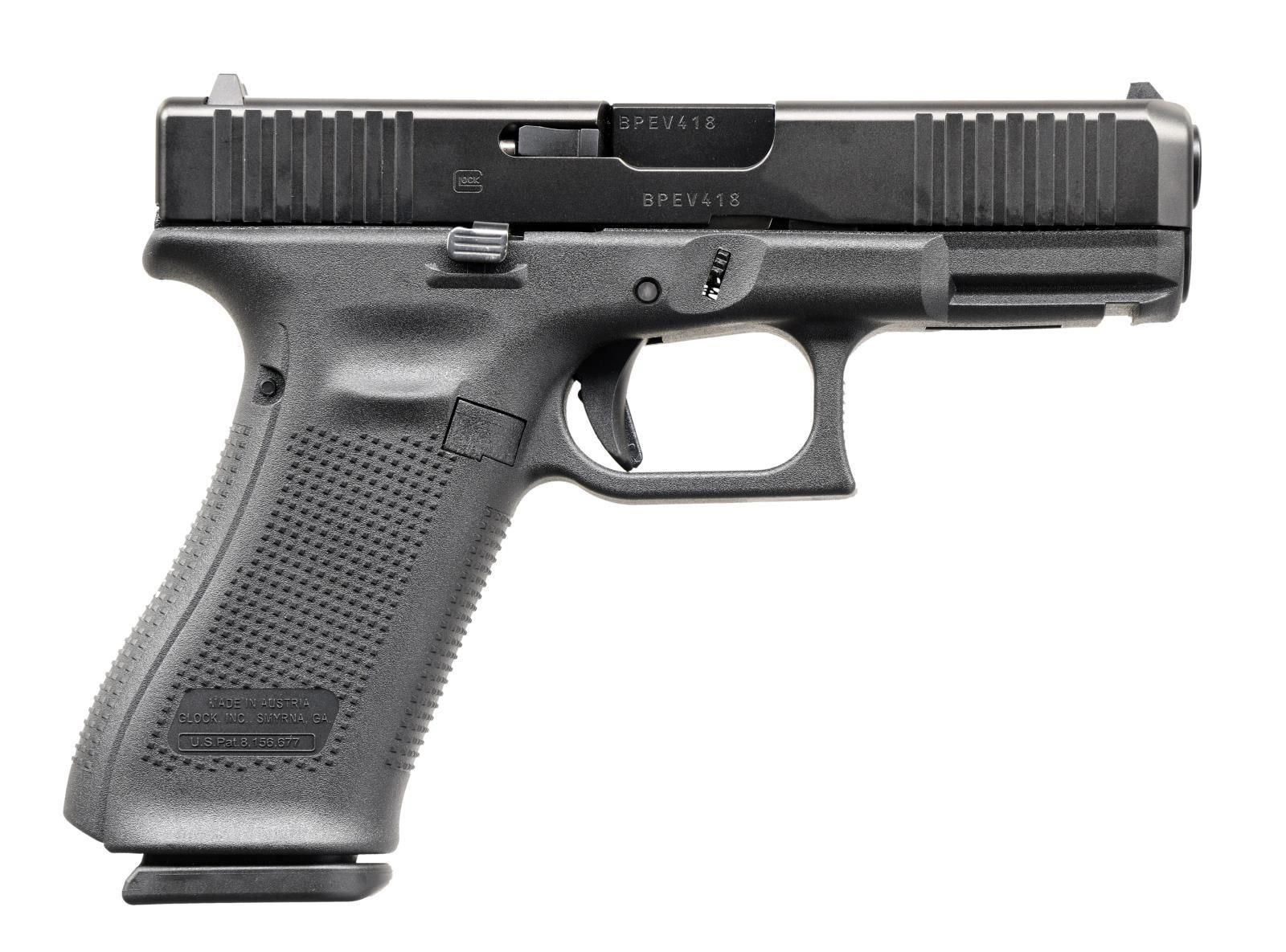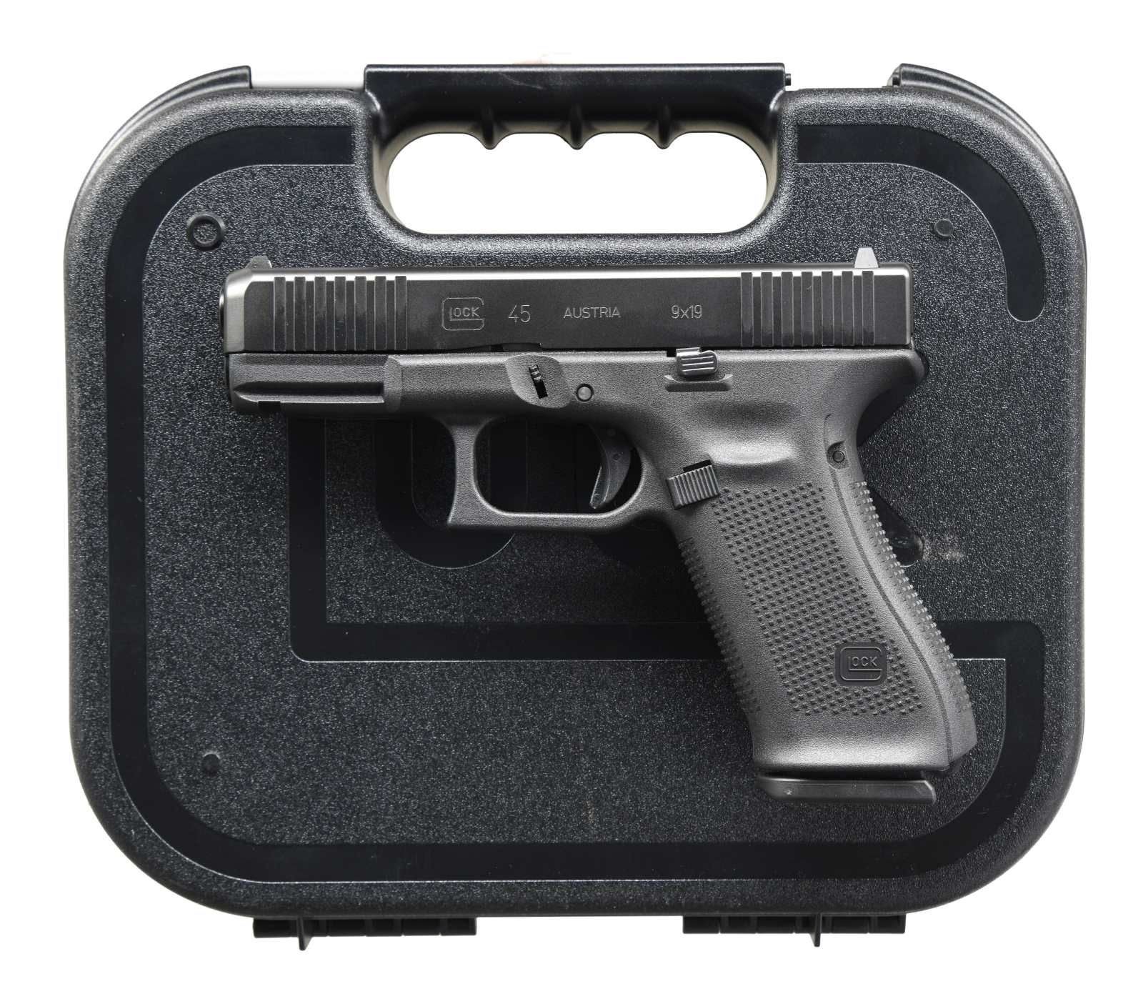 Cal. 9x19. S# BPEV418. Bbl. 4". Standard white outline Glock sights. Austrian made Glock 45. Matte black finish. Polymer frame w/ accessory rail. MAGS: 2-17 rd. UNATTACHED ACCESSORIES: matching numbered factory hardcase that is missing one of its latches w/ mag loader, manual, cleaning rod, & cable lock. CONDITION: all aspects near excellent. PROVENANCE: collection of Gun Sport Ltd owned by Jon R. Thomas. (23-3139/MJC). MODERN. $350-500.