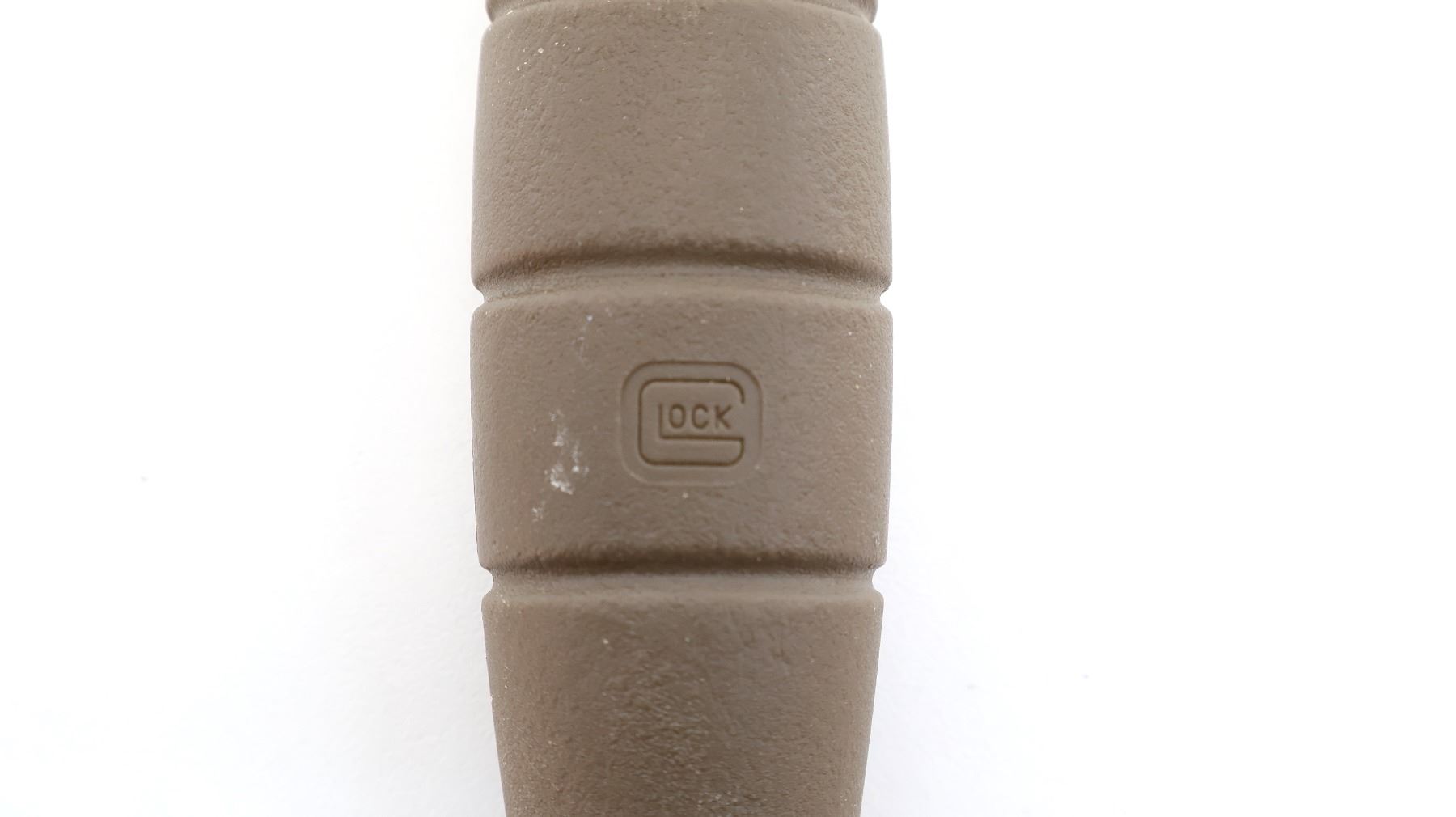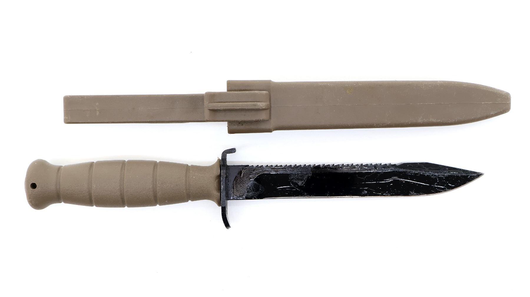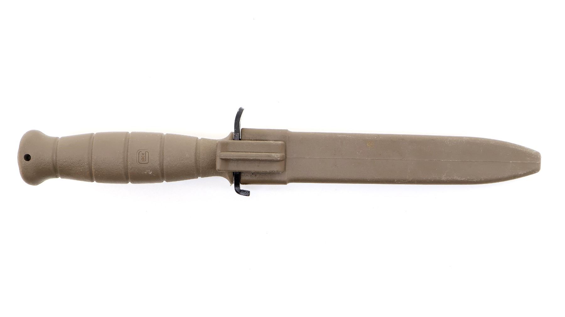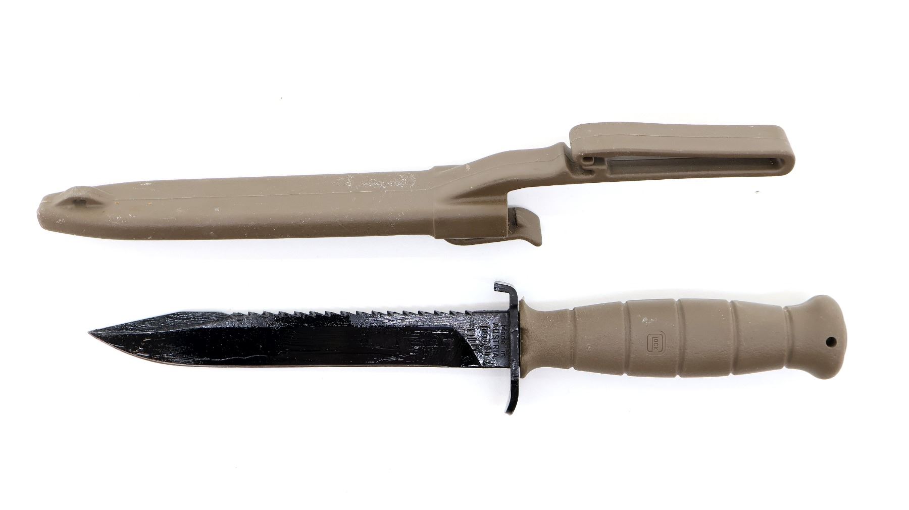 (1) STEEL BLADE, SERRATED EDGE, MARKED "GLOCK 81", ETC., POLYMER HANDLE, MARKED "GLOCK", SHOWS WEAR & TEAR / USE MARKS, BLADE OVERALL LENGTH APPROX. 6 3/8", OVERALL LENGTH APPROX. 11.5", WITH BROWN POLYMER SHEATH, MARKED "GLOCK". SEE PHOTOS.