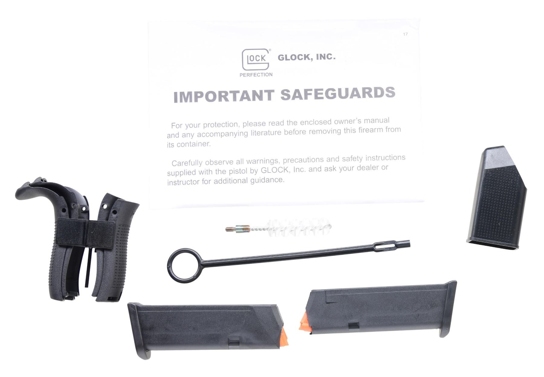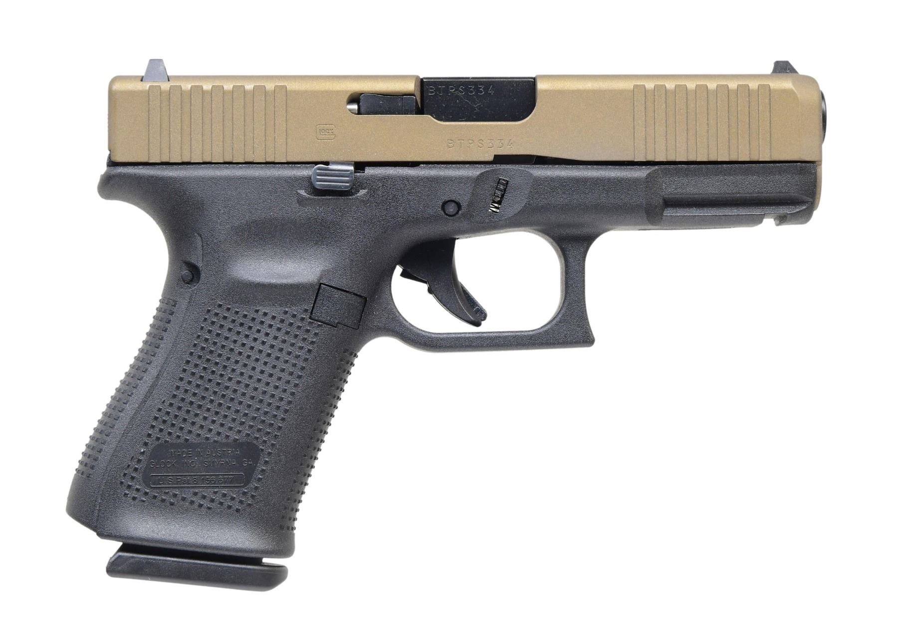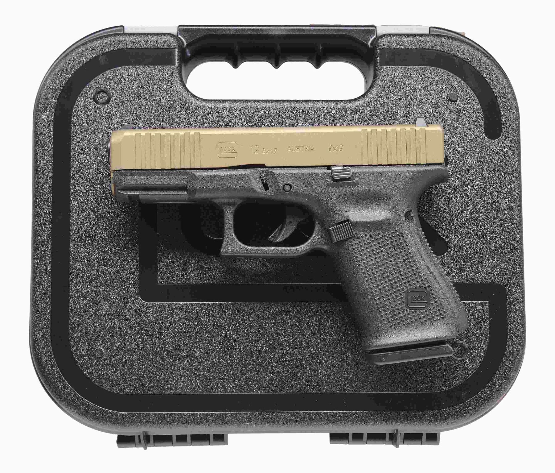 Cal. 9mm Luger S# BTPS334. This Glock Model 19 Gen 5 features a black polymer frame with a factory FDE (Flat Dark Earth) finish on the slide. It has a 4.02" barrel with fixed white dot front and rear sights. The frame includes a left-side slide release and a left-side magazine release. MAGS: three 15 Rds. UNATTACHED ACCESSORIES: factory box, backstraps, speed loader, cleaning rod, brush, and manual. CONDITION: overall near excellent condition. The slide retains approximately 98% of its original finish. The frame shows minimal wear. The bore is bright with sharp rifling. PROVENANCE: the collection of Gun Sport Ltd., owned by Jon R. Thomas. (23-4621/MD). MODERN. $300-500.