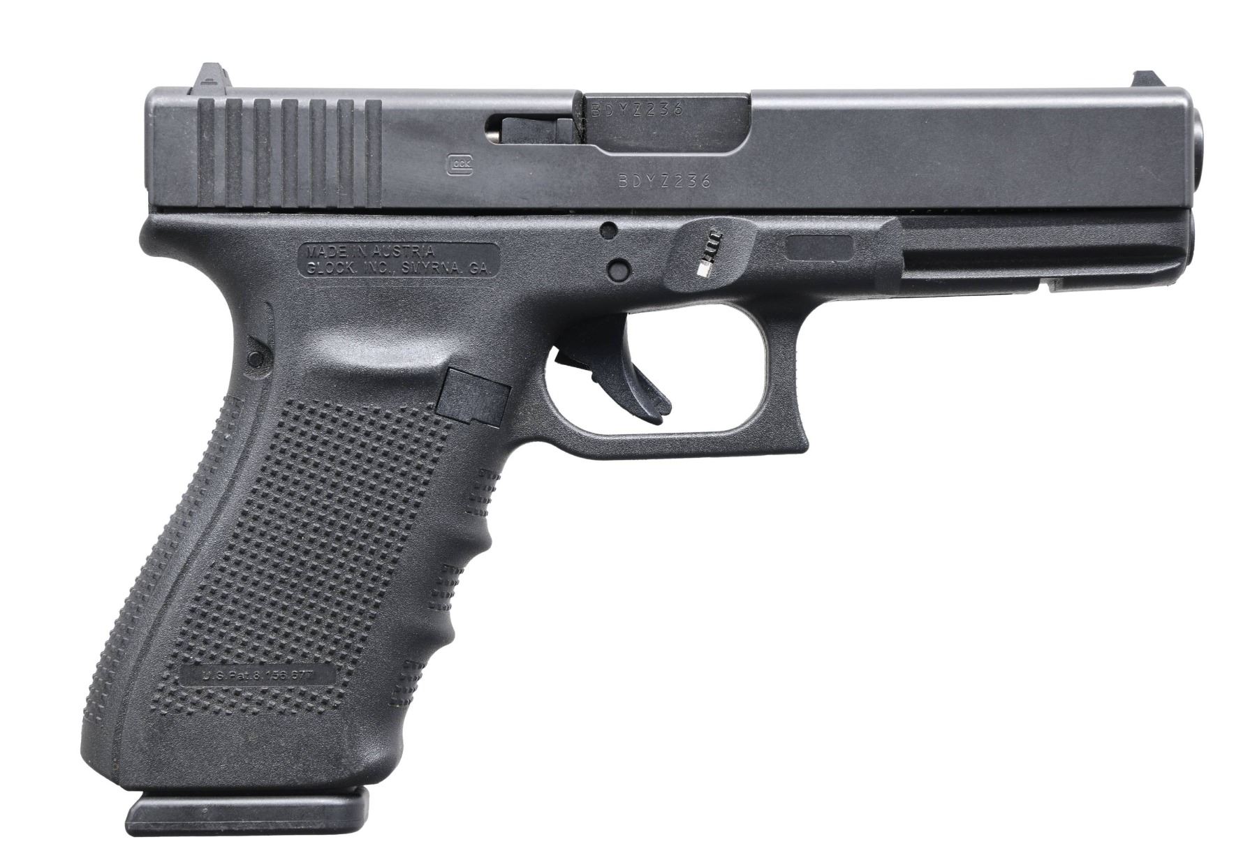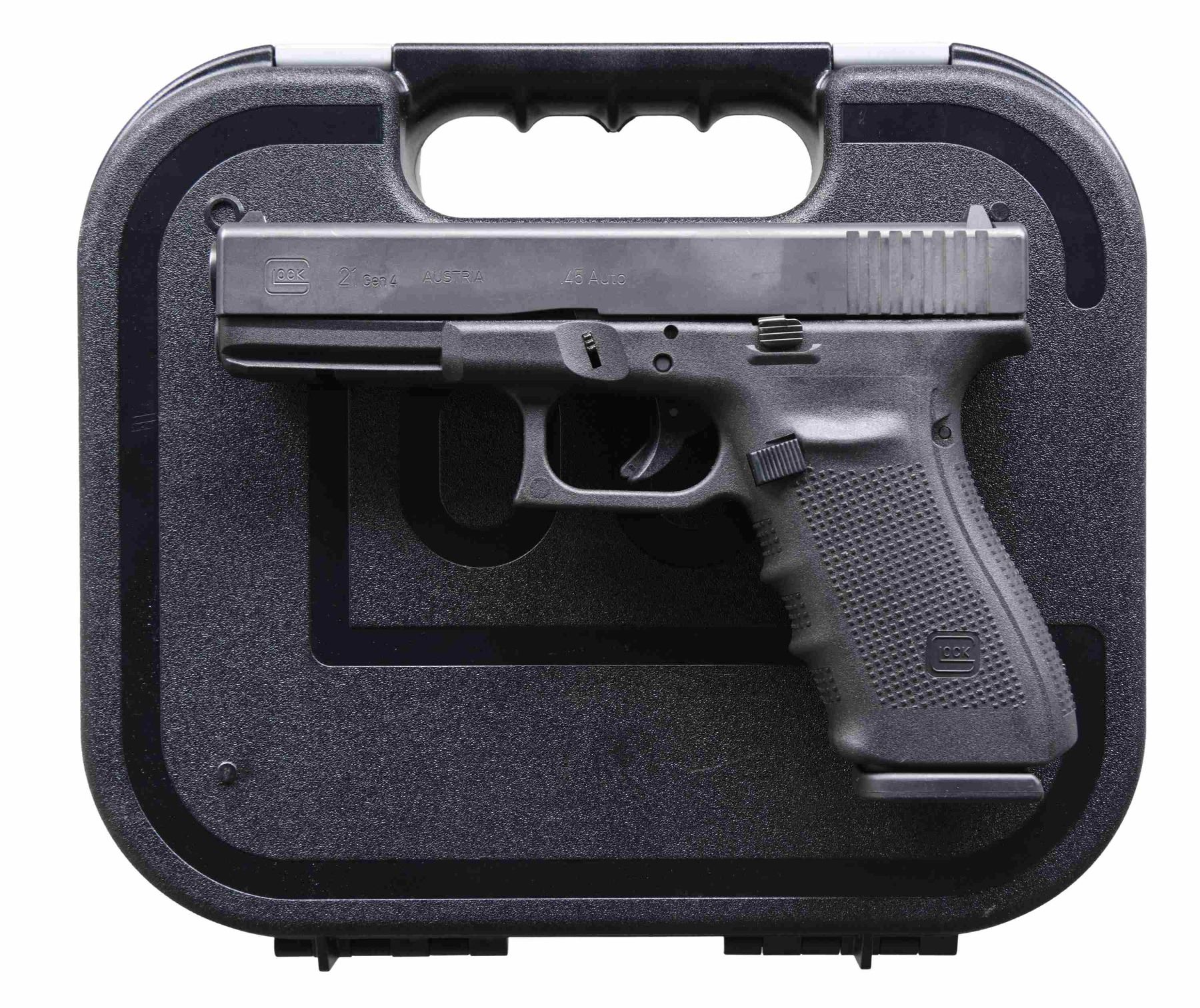 MATCHING FACTORY HARD CASE. Cal. 45 ACP. S# BDYZ236. Bbl. 4 1/2". Model 21 4th Gen semi-automatic pistol mfg. in Austria by Glock and imported by Glock Inc. Standard markings on slide, denoting the model and cal. designations. Slide and bbl. exhibit a matte gray finish. Black polymer frame. Standard white dot front sight, with square notched rear sight. MAGS: 2 13-rd. UNATTACHED ACCESSORIES: matching factory hard case. CONDITION: very good, with metal components retaining the vast majority of their original factory finish, exhibiting some scattered superficial handling marks overall. Mirror bore, exhibiting strong rifling throughout. Frame is very good overall. PROVENANCE: From the Lifelong Collection of George Staden S&W Member #3451. (25-23/MLW). MODERN. $300-500.
