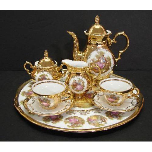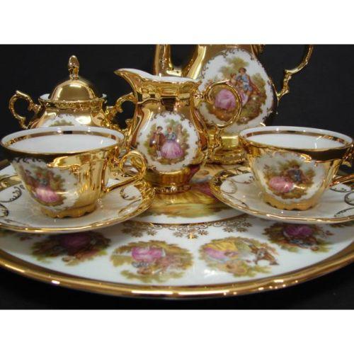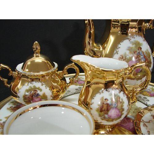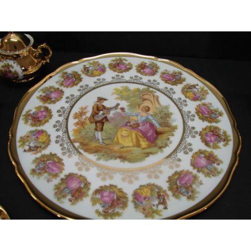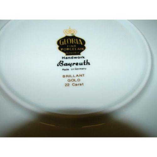 GLORIA (1947-1981+) 8 PIECE PORCELAIN GOLD LUSTER TEA SERVICE. Consists of tray (13” Dia.), teapot (7.5” H), creamer (3.5” H), covered sugar (4” H), 2 cups (2” H), and 2 saucers (4.5” Dia.). Pieces are decorated with transfer decorated Renaissance courting scenes. Marked on bottom “Gloria/Fine/Porcelain/Bavaria/Handwork/Bayreuth/Made in Germany/Brillant/Gold/22 Carat”.