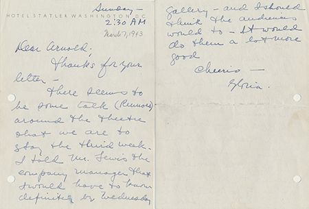(1897 - 1983) American silent film star starring in numerous melodramas. Lot of two items, includes: A.L.S. "Gloris", 8pp. 8vo., Washington [Mar. 7, 1943], to "Arnold". Swanson discusses the rumored extension of a theater production: "...If I should not remain here for a third week I shall leave here a week from today...Mr. Fischer will be very silly if he...replaces us with another 'low comedian' juggler or seals...". File holes at left, else very good. Sold with a stipulation in which defendant Swanson accepts a $250 payment from plaintiff Celia R. Alin to settle a case, signed by Swanson at bottom and initialed twice. Two pcs.