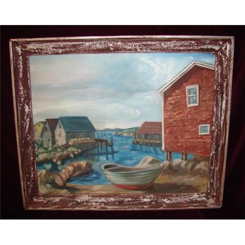Mid 20TH Century Painting of a Boat in a Dock. I am sure it s Motiff #1 Rockport, Gloucester North Shore Cape Ann Painting. This painting is signed by Alesa. It is on board and the painting measures 20' X 16" And is mounted in a frame that has a lot of character and goes well with this painting. The frame measures 22 1/2" X 19". Nice soothing and relaxing subject. Good Condition.