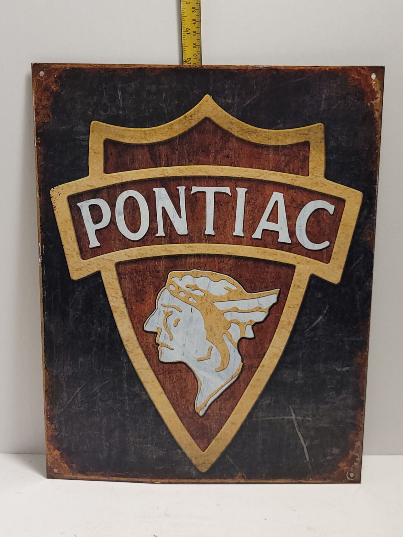 GM PONTIAC TIN METAL SIGN. MEASURES 12.5"X16". POSSESSES THE OFFICIAL GM HOLOGRAPHIC STICKER ON THE REVERSE SIDE