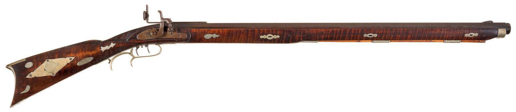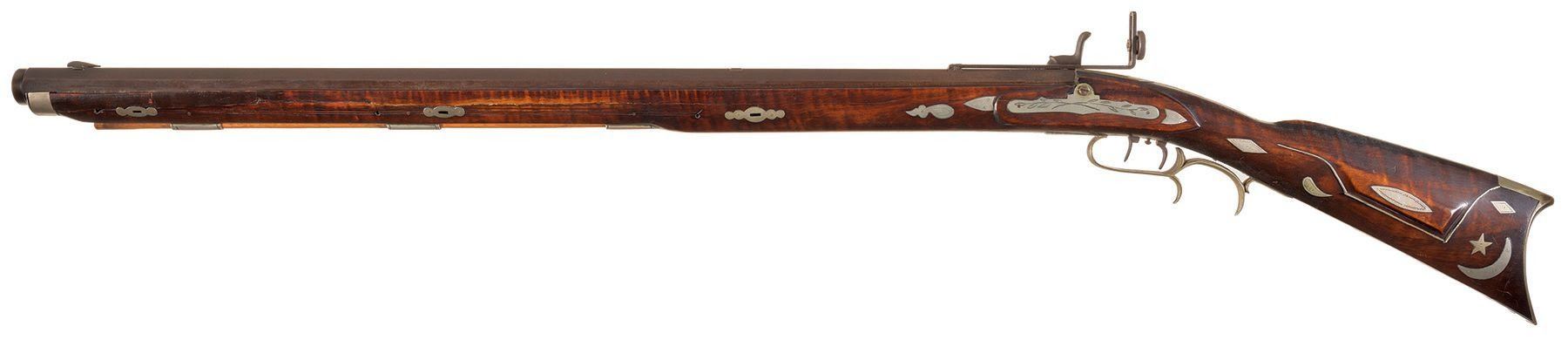 Fabulous late 1800's percussion full stock rifle in 45 caliber, with beautifully figured wood, decorative silver inlays, and 31 1/2" extra heavy octagon barrel.