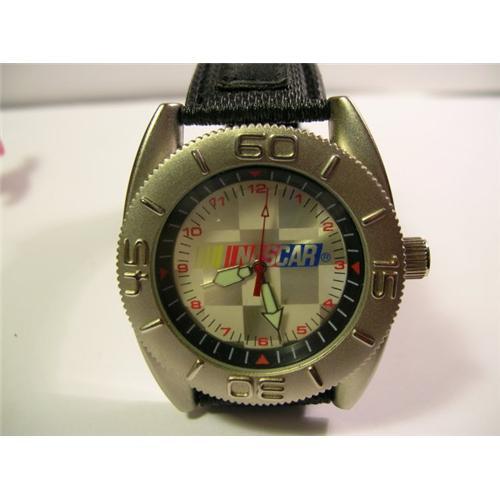 GNARLY NASCAR GENT'S OVER-SIZE DIVER'S STYLE QUARTZ WATCH W/RATCHETING ROTATING BEZEL,NASCAR FACE W/RED ARABIC NUMBER'S AND HUGE LUMINOUS HOUR/MINUTE HANDS AND RACE CAR RED SECOND'S HAND WITH HUGE RUBBER STRAP AND ACCENTING CLASSIC TANG BUCKLE. THE WATCH IS BASICALLY NEW AND READY TO WEAR!