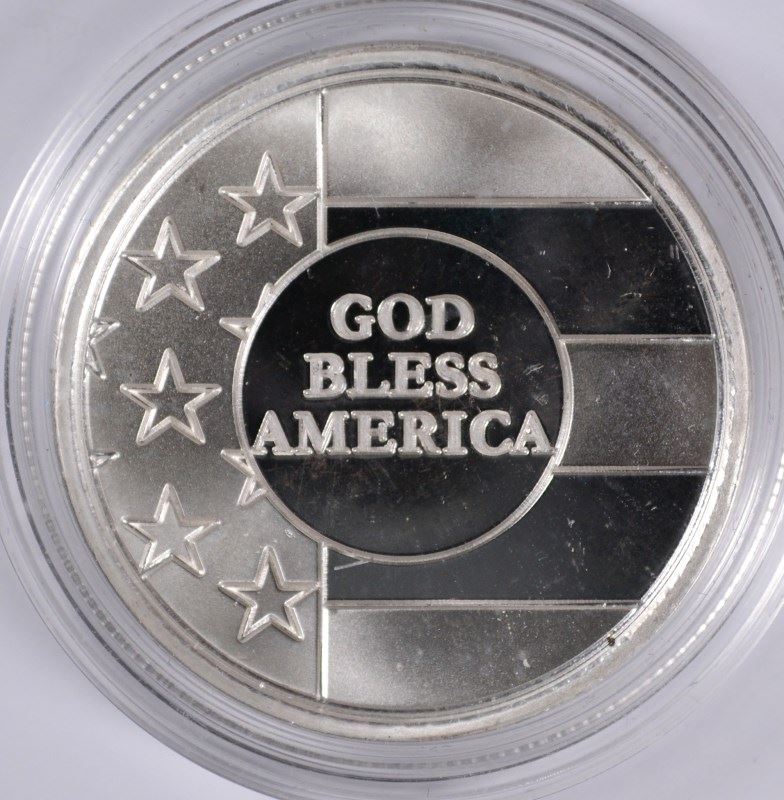 "GOD BLESS AMERICA" ON A ONE OUNCE .999 SILVER ROUND IN PLASTIC CAPSULE
