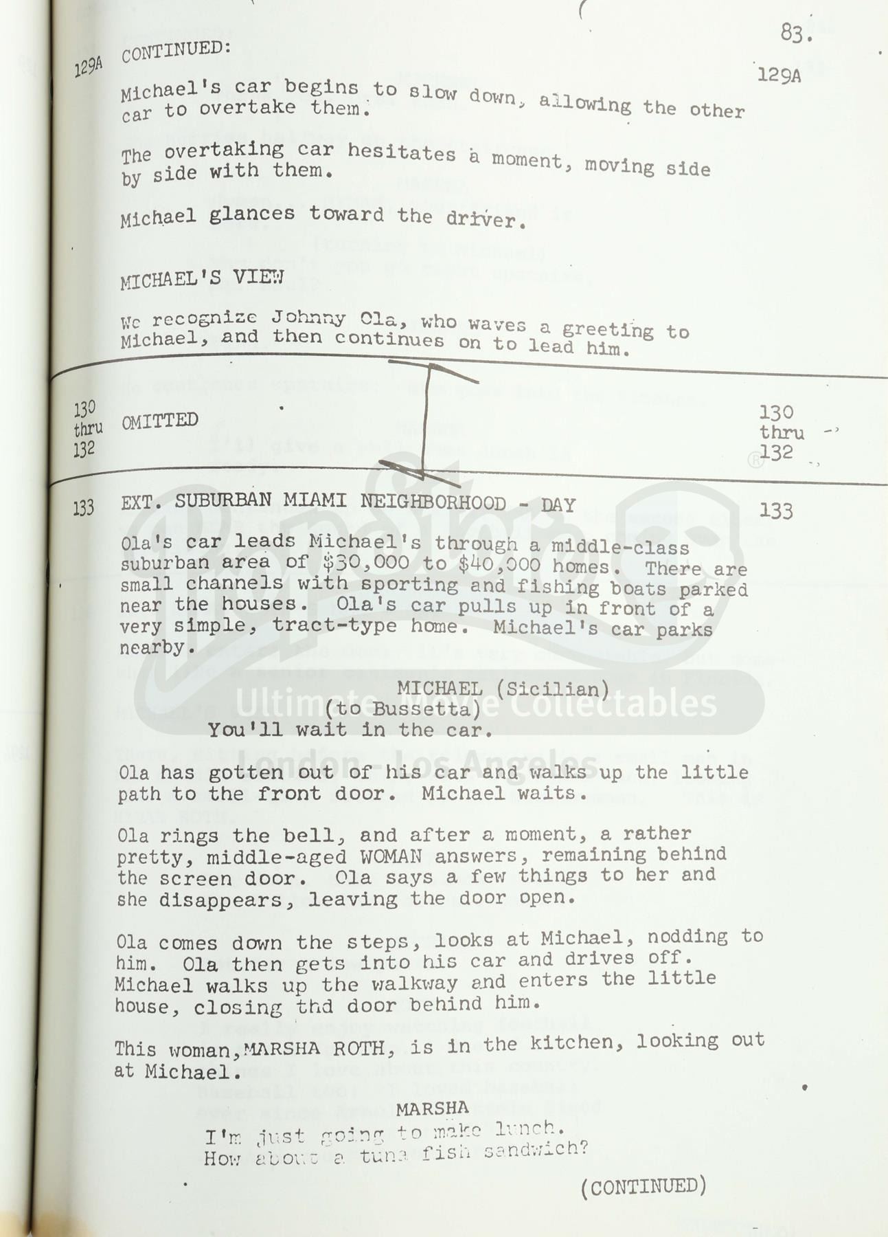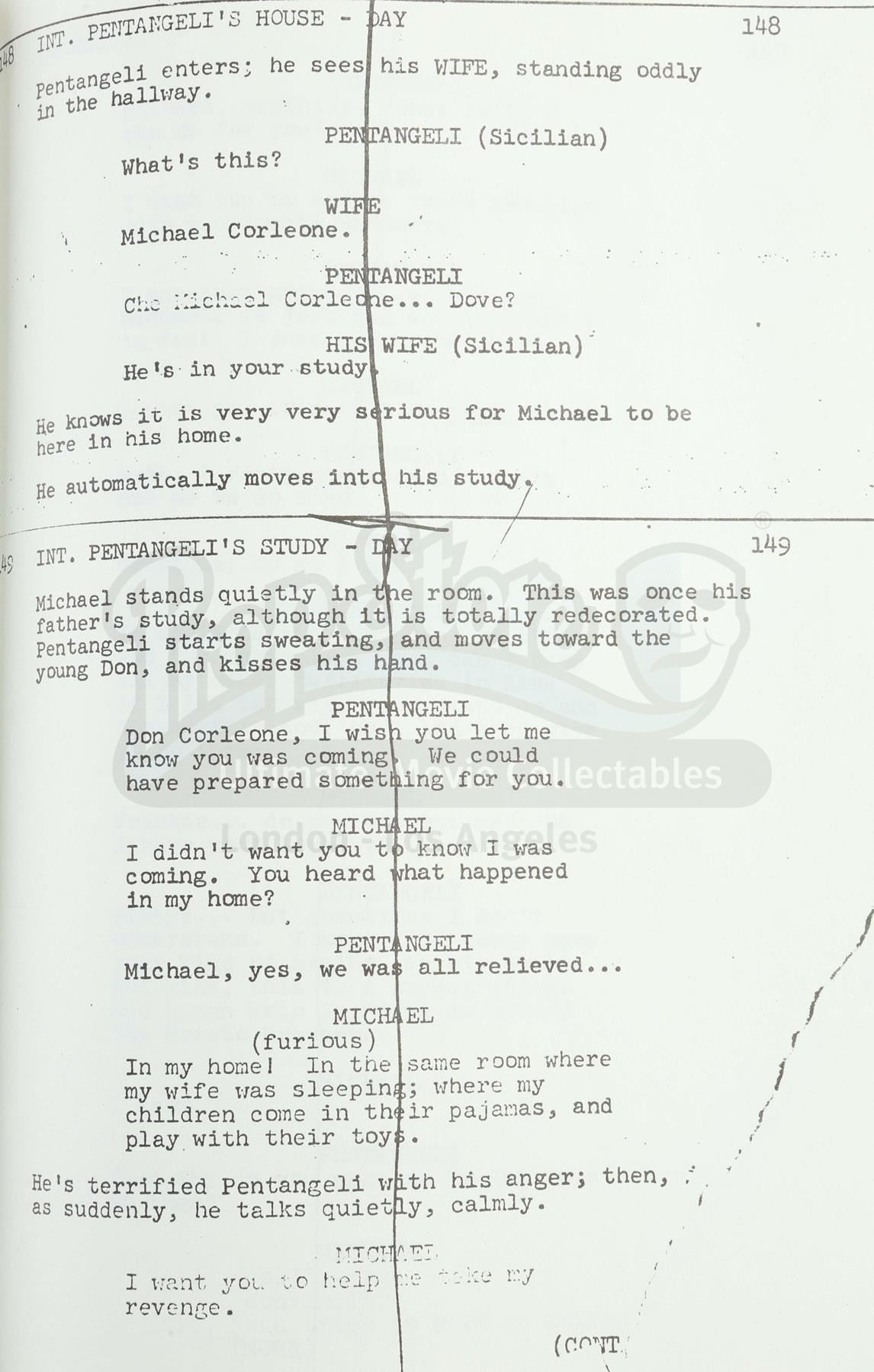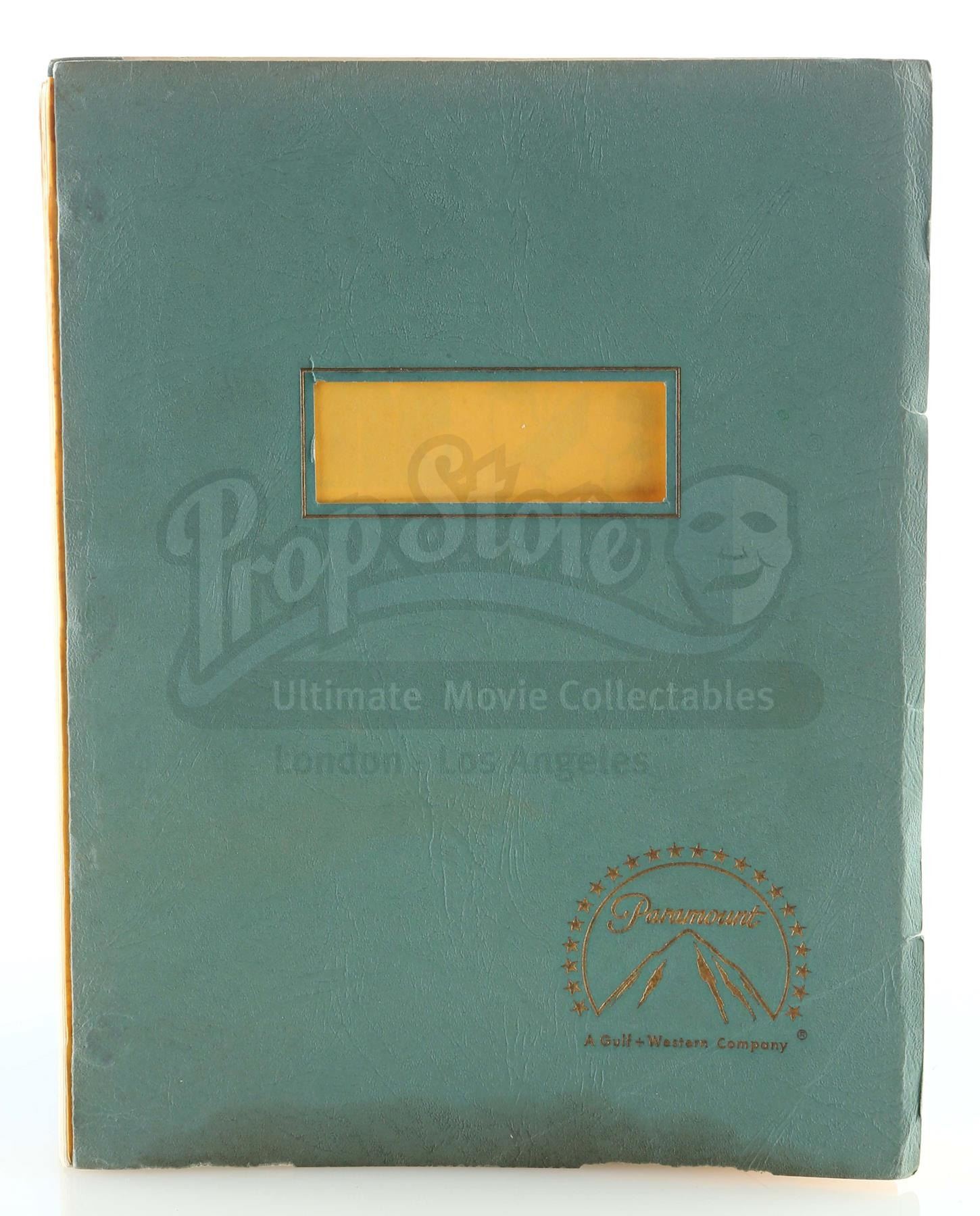 This 200-page script by Academy Award-winning writers Mario Puzo and Francis Ford Coppola is dated "September 24th, 1973" and marked "Second Draft". It features several scenes not contained in the final film, with printed strike-through lines over certain sections. The script is secured with three brass brads in a seafoam-green card-stock cover with the Paramount Pictures logo stamped on the front and a goldenrod page noting it as the property of cameraman James A. Conter.