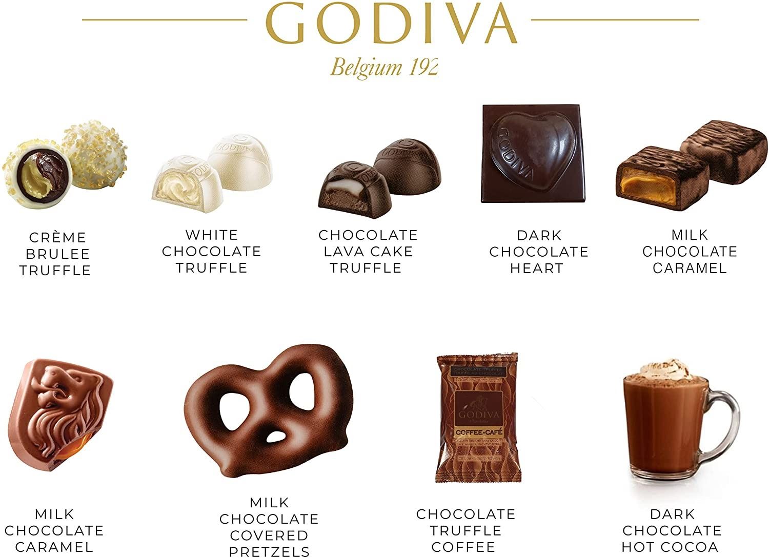 CHOCOLATES. RETAILS FOR $92.99. CONTAINS CHOCOLATE LAVA CAKE TRUFFLES, WHITE CHOCOLATE TRUFFLES, CREME BRULEE TRUFFLES, MILK CHOCOLATE COVERED BAVARIAN PRETZELS, DARK CHOCOLATE HOT COCOA, MILK CHOCOLATE CARAMEL "LION OF BELGIUM", DARK CHOCOLATE GANACHE HEART BAR, AND CHOCOLATE TRUFFLE COFFEE. BEST BEFORE 21/05/01