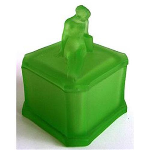 This green satin glass figural powder jar known as GODIVA is shown and described on pages 32-33 in Whitmyer: Bedroom & Bathroom Glassware of the Depression Years. With a striking Art Deco design featuring a sitting flapper girl, with outstreched legs, resting against a tiered column. The base, like the lid, is eight sided and diamond shaped. She is beautifully executed with fine definition and attention to detail. The jar with lid measures about 5 x 4 inches and, with the exceptions of a tiny nick or two on the bottom, are both in excellent condition