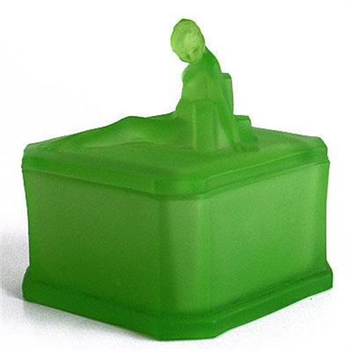 This green satin glass figural powder jar known as GODIVA is shown and described on pages 32-33 in Whitmyer: Bedroom & Bathroom Glassware of the Depression Years. With a striking Art Deco design featuring a sitting nude flapper girl, with outstretched legs, resting against a tired column. The base, like the lid, is eight sided and diamond shaped. She is beautifully executed with fine definition and attention to detail. The jar with lid measures about 5 x 4 inches and, with the exception of a tiny nick under the rim, are both in excellent condition