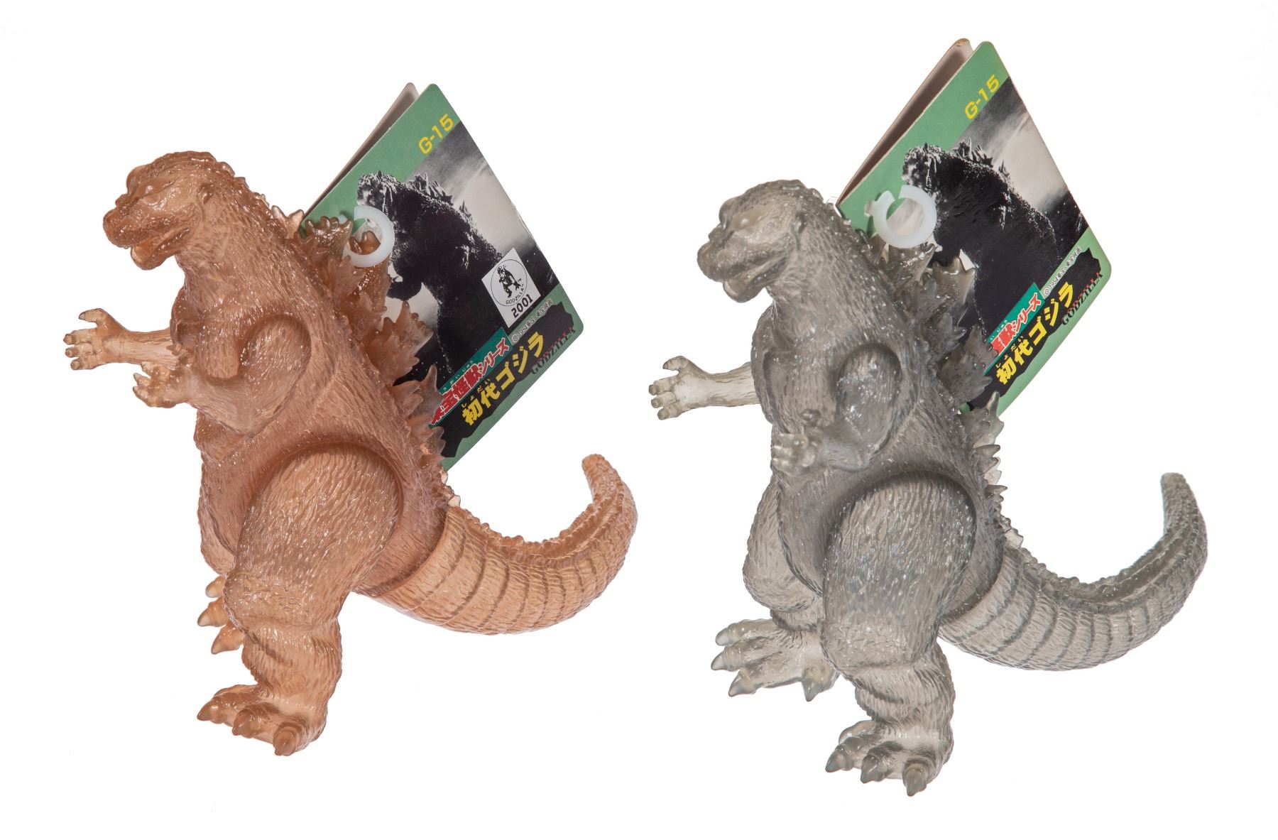 2001. Bandai Vinyl Figure w/ tag Tsuburaya Festival Set of 2 - Sepia Clear & Gray Clear. 6” tall figures. VG+.