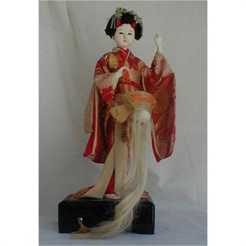 A most interesting Gofun Geisha, of great balance and design. She holds the Samurai helmet of her lover in her hand, and the hair trails over the base. The dolls features are well painted, and her clothing is fine silk and brocade. She is mounted on a black lacquer base with a drawer to the left.