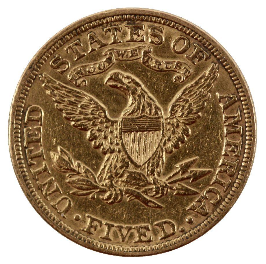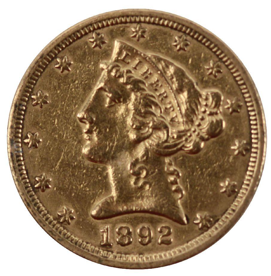 A gold $5.00 Liberty Half Eagle XF/AU example dated 1892.