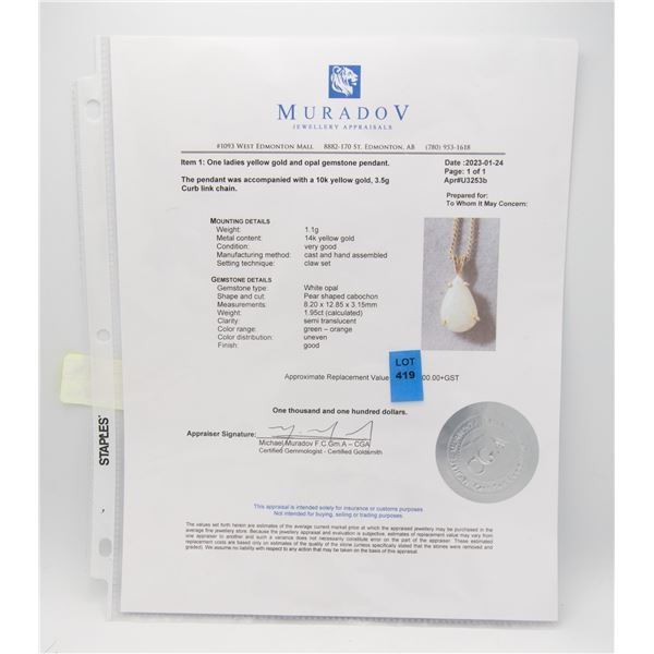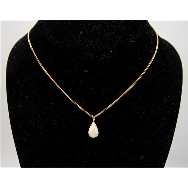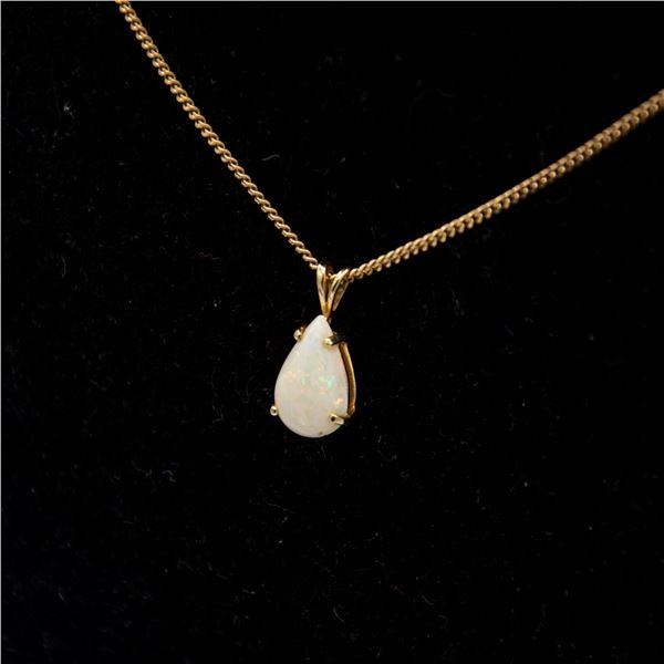 WHITE OPAL. PEAR SHAPED CABACHON MEASURES 8.2 X 12.85 X 3.15 MM AND WEIGHS 1.95 CARATS. COLOUR RANGE IS GREEN-ORANGE. REPLACEMENT VALUE $1100: . ESTATE **ALL ITEMS MUST BE REMOVED BY 5PM SATURDAY, MARCH 4TH 2023. ALL REMAINING ITEMS WILL BE SUBJECT TO A $6.00 PER DAY STORAGE CHARGE. ANY ITEMS REMAINING AFTER MONDAY, MARCH 20TH, 2023 WILL BE CONSIDERED FORFEITED. NO REFUNDS WILL BE ISSUED FOR FORFEITED ITEMS. TO SCHEDULE A PICK UP APPOINTMENT CLICK HERE