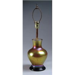 Lot 369 GOLD AURENE LAMP BASE Steuben Aurene lamp base has gold Aurene finish with strong lavender and blue iridescence. Base may have been a vase, converted to lamp base. Glass section of base rests on wooden foot and is capped with a homemade aluminum disk. SIZE: Base, not including riser is 10-3/4” t. CONDITION: Spider to one side of base. 5-70319