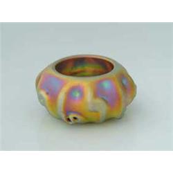 Lot 1184A. GOLD AURENE SALT. Wonderful pigtail salt has nice gold iridescence with highlights of blue and purple. Signed on the bottom “Aurene”. SIZE: 2-3/4” dia x 1-1/2” t. CONDITION: Small scratch to iridescence at lip, otherwise very good. 5-69086 (200-300)