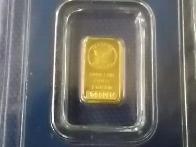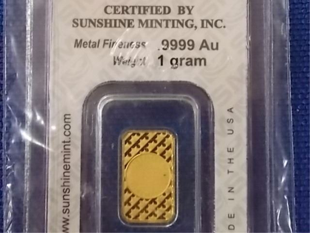 GOLD BAR - 1 GRAM .999 FINE GOLD BAR - SUNSHINE MINTING (SMI) - SECURITY PACKAGED WITH DECODER ON BACK - INCLUDES CERTIFICATE