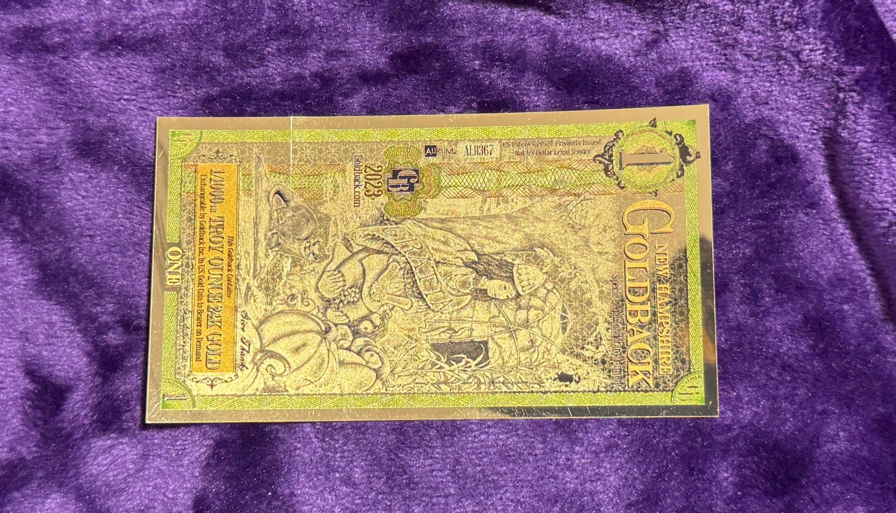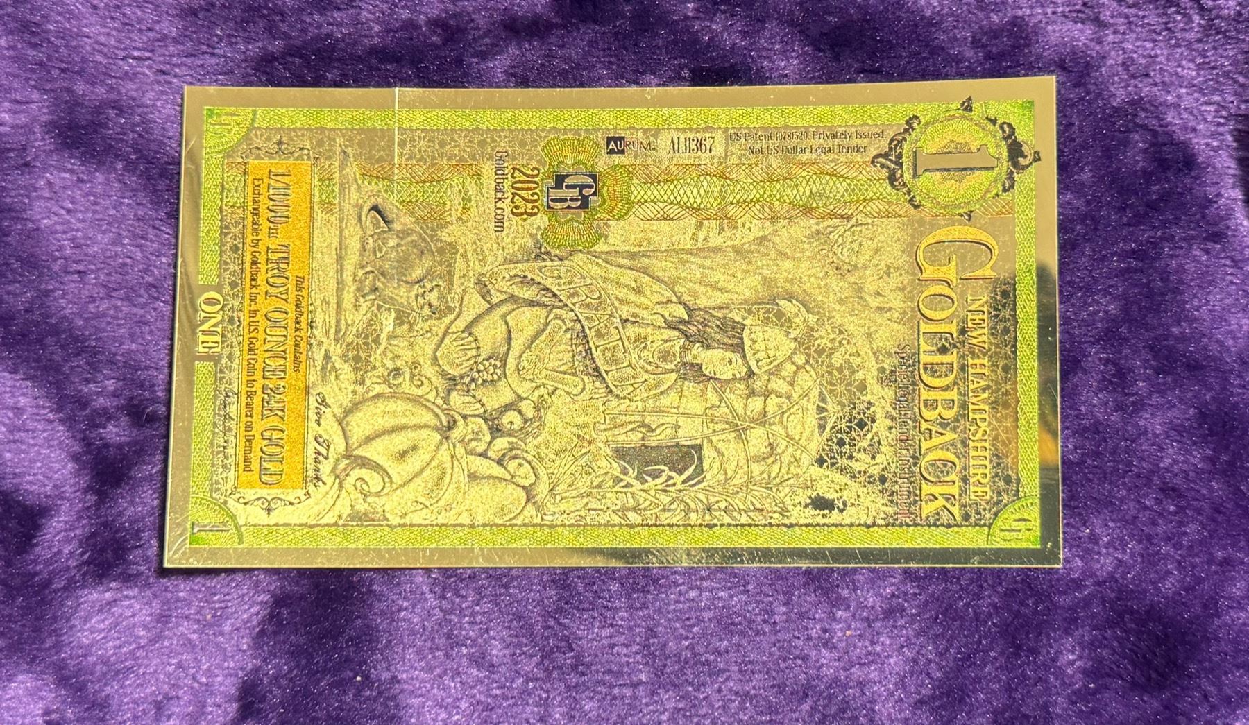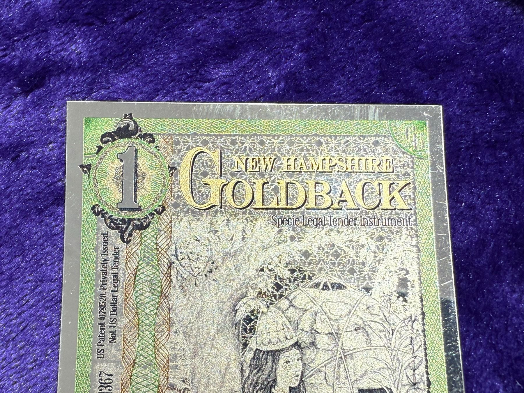 THE NEW HAMPSHIRE GOLDBACK IS AN INNOVATIVE GOLD-BACKED BILL, REPRESENTING A NEW ERA IN PRECIOUS METALS OWNERSHIP; CONTAINING 1/1000TH TROY OUNCE OF 24-KARAT GOLD, THIS BILL IS PART OF THE REVOLUTIONARY GOLDBACK SERIES, OFFERING A UNIQUE WAY TO USE GOLD IN EVERYDAY TRANSACTIONS OR AS A COLLECTIBLE ITEM