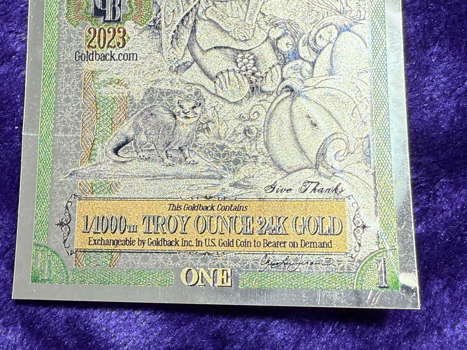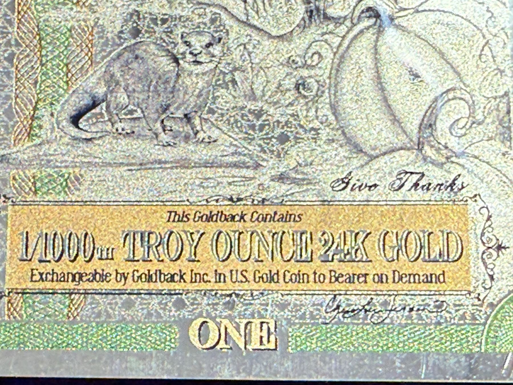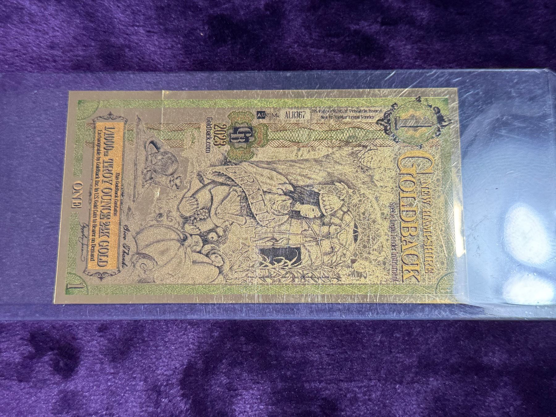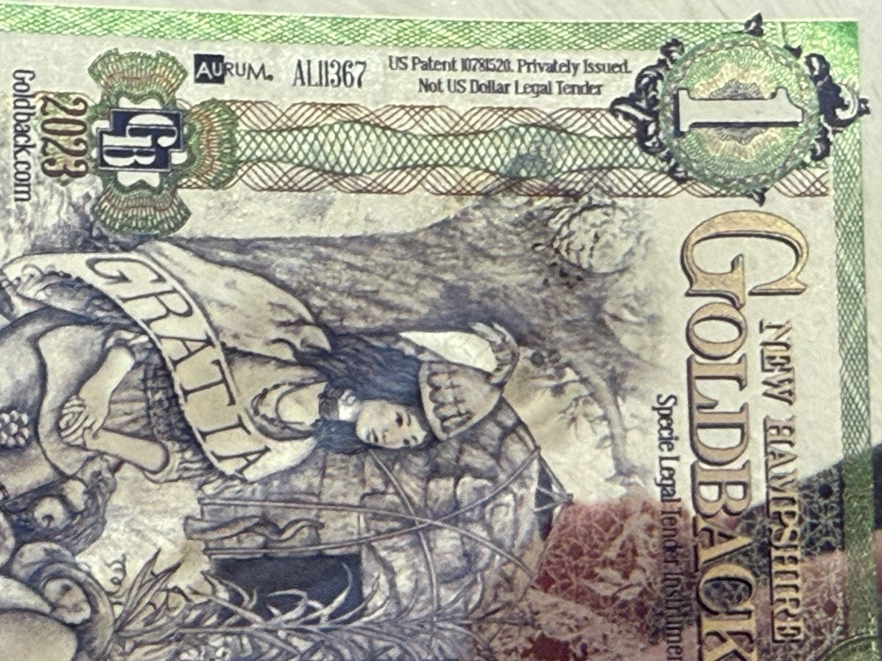 THE NEW HAMPSHIRE GOLDBACK IS AN INNOVATIVE GOLD-BACKED BILL, REPRESENTING A NEW ERA IN PRECIOUS METALS OWNERSHIP; CONTAINING 1/1000TH TROY OUNCE OF 24-KARAT GOLD, THIS BILL IS PART OF THE REVOLUTIONARY GOLDBACK SERIES, OFFERING A UNIQUE WAY TO USE GOLD IN EVERYDAY TRANSACTIONS OR AS A COLLECTIBLE ITEM