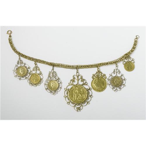 <B>GOLD COIN, GOLD CHARM BRACELET</B></I><BR><BR>The 14k yellow gold bracelet suspends seven gold coin charms; one Peruvian, 5 Soles, and six US $1. A collection of six loose charms: one US $1, three Mexican 1 Pesos, and two Spanish coins accompany the bracelet. Gross weight for the lot 43.00 grams.<BR>Bracelet length: 8in.<BR>Note: Coins have been soldered into their bezels.<BR><BR> <B>Condition Report:</B> Good condition.<BR><BR><b>Shipping:</b> Miscellaneous Collectibles, Smal (<a target="_blank" href="http://www.heritageauctions.com/common/shipping.php">view shipping information</a>) <BR><BR><B>Important notice:<